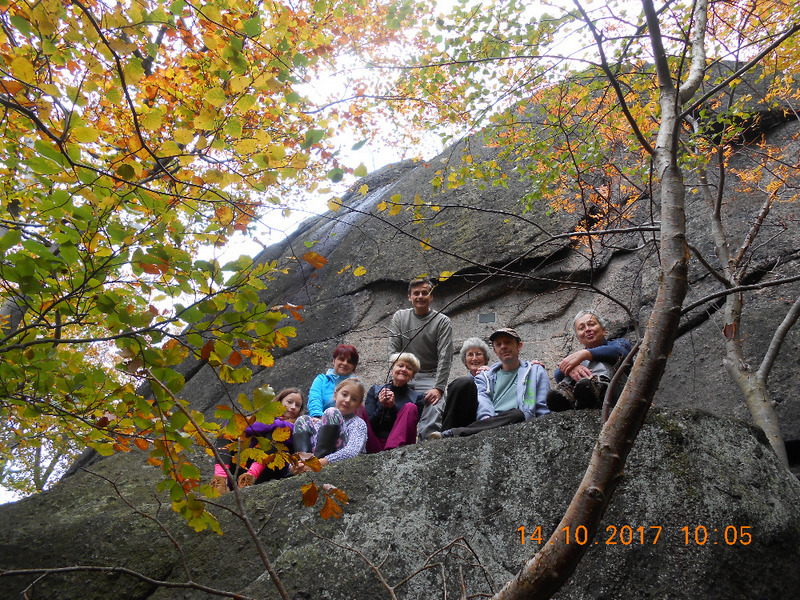 ostatní odpočívali v leže olizujíc se psem, jiní z nás se kochali barevnou přírodou pomalu zapadajícího slunce. Blížila se 17 hodina teplota okolo 15 stupňů, když se putující rozhlíželi na rozcestí kudy jít k Poledním kamenům. Průvodce mne prozradil o svých dědičných bolestech zrovna při dnešním výstupu do hor, o změně léků, o polyneuropatii. Překvapivě jsme u rozcestníku nebyli sami. Dost turistů nás míjelo či již se vyskytovali v dáli na velikém kameni. Že by všichni chtěli přespat na Poledních kamenech ? Naštěstí, když jsme došlapali k cíli, turisté postupně mizeli, stíhajíc za světla sešup do bezpečných nížin.