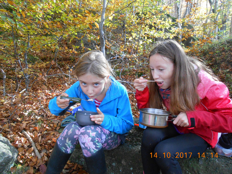 Krásná planinka se skalnatým výhledem nás oslovila na obědovou pauzu. Na plynovém vařiči na Čínské cestě se uvařila čínská polévka s kuřecím šmrncem, jiní jedli vlastní oběd svačinového typu.