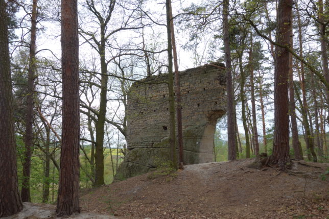 Ruina kruhového tvaru již bez střechy na místě z cca 16. století se zarostlým náletem chátrá od r.1945. O něco hezčí tvrz vytesaná do skály se schůdky na upravenou vyhlídku, stála o kilometr dále.