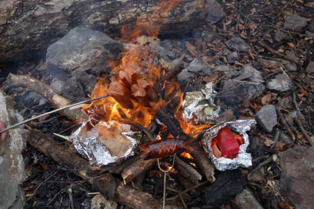První úskalí máme za sebou. V poho. Teď rozdělat oheň. Jen kdyby tolik nefoukalo. Už to vypadalo, že buřtíky sníme syrové, ale po několika důležitých pánských radách, kdy ženy zběsile škrtaly sirkami, vzplál plamínek. Vytáhli jsme skládací opékací vidličky, nasunuli párky a …… Bože! Taková dobrota!