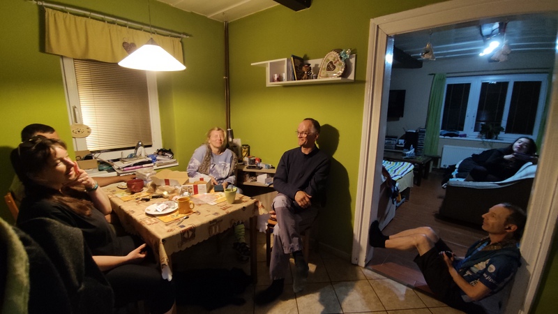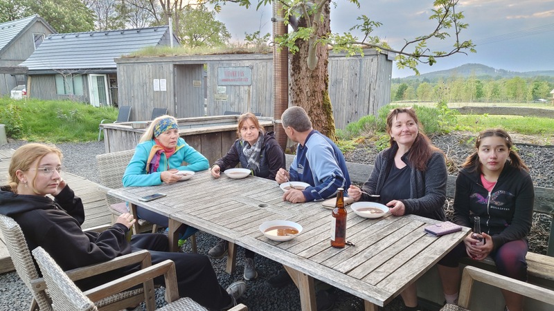 Paní Monika mluvila obstojně česky, sem tam rusky, lužicky a hlavně německy. Nám věnovala naši mateřštinu neb v Čechách studovala. Vstřícně poukázala, kde se co nachází, dostali jsme k večeři brambory na loupačku, tvaroh, cibuli, sádlo, máslo a nápoje.
