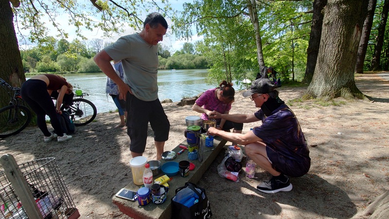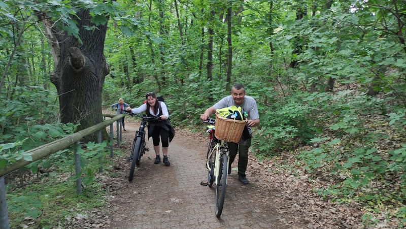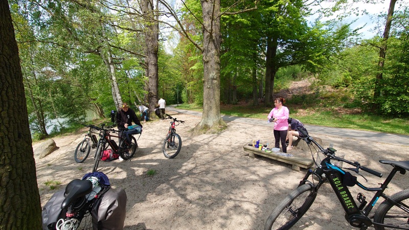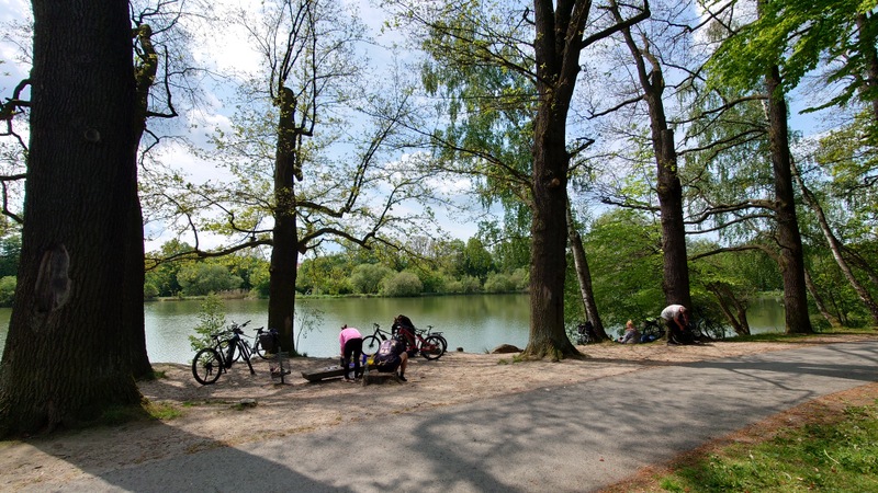 a pokračovali v dobré náladě na sever podél Sprévy. Samozřejmě, kdo využíval motor užíval si okolí cyklostezek, kdo ho neměl, dýchal jak mohl, aby většinu peletonu dotáhl.