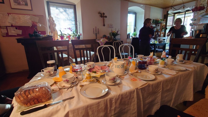 O nedělním ránu nedočkavci jídla se cpali u své první snídaně. V 8 hodin se celá skupina přesunula do přízemí do obýváku, kde nás očekávalo bohaté pohoštění i s paní domu.