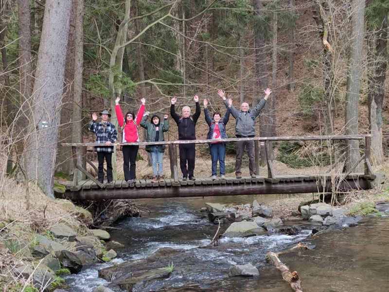 Stojí za zmínku překročení po dřevěné lávce, pod níž se drala jarní voda Bulovského potoka. Vlak z Minkovic stihli obě skupiny bez větších potíží. Ta druhá si navíc prošla okruh kolem řeky Smědá a zpět.