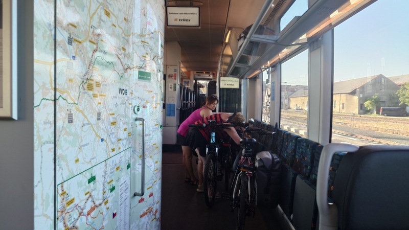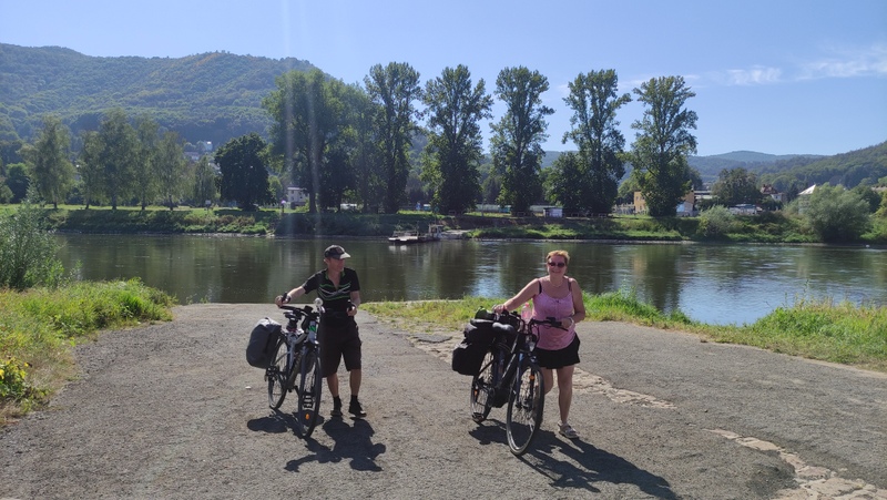 Co teď? Kousek od břehu stála restaurace, čas na oběd také byl, nu aspoň se dohodneme jak dál. Nastaly dvě varianty. Buď pojedeme po hlavní až Děčína asi 20km nebo nasedneme do vlaku. Jedna hodina, slunce pálilo, únava se ozývala musel jsem se rozhodnout. Samozřejmě by mne ženské nechaly, ať si jedu na kole sám, čímž mne nasměrovaly k jejich úvaze pohodlnějšího odjezdu. Po obědě se určila cesta k zastávce jejíž trasa nebyla z nejjednodušších. Jakoby si s námi české dráhy při rekonstrukcí zastávek a nádraží dělaly legraci opět se zde nacházel krátký výtah. Situace se vyřešila odepnutím batožin, kolem vzhůru a nástupem na peron. Tady jsem se podivoval nad úvahou Marušky, která by kola vedla přes zákaz přes koleje. Nasedli jsme do klimatizovaného vagonu do Děčína za jízdné za ceny DÚ nakoupené přes Idos, abychom s krkolomným výstupem přemístili do Trilexu s odjezdem za 7 min. Závěr cyklodne odstrašující, ale pro příště poučný. Víkend se celkově vydařil, ač se dá mnohé doladit (výstup s koly v Děčíně východ), určitě se na fascinující Sněžník Děčínský opět navrátíme, třeba na podzim…
