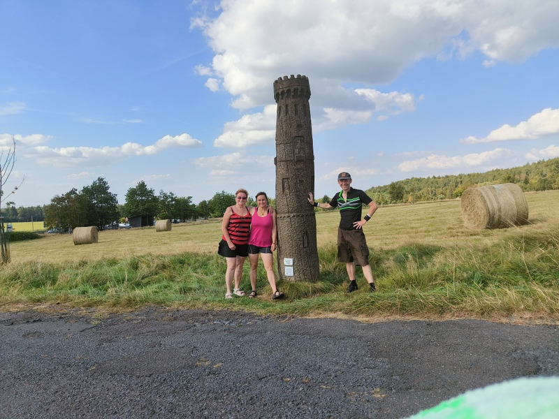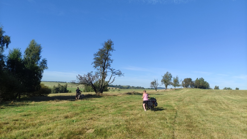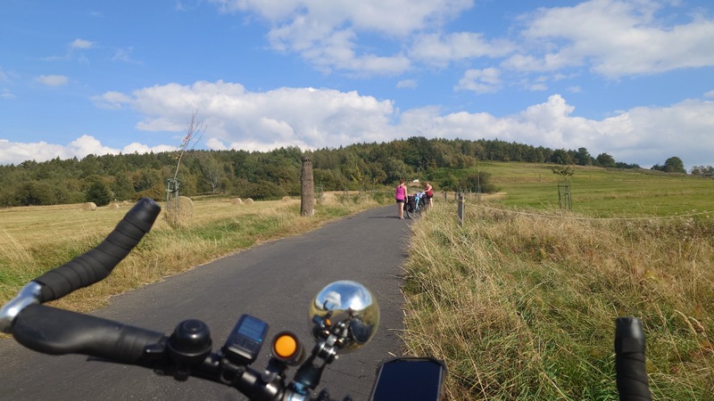 U Hotelu Hřebenová bouda na křižovatce na úpatí kopce trojice odbočila na asfaltku směřující k vytouženému cíli. Okolí mi připomínalo svou samotou Šluknovsko či okolí hranic z Německem. Samé louky sem tam domek nebo malá vesnička.