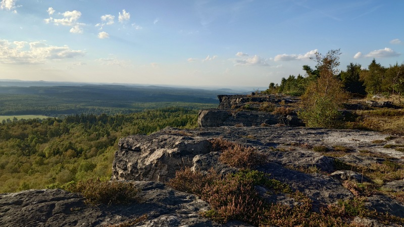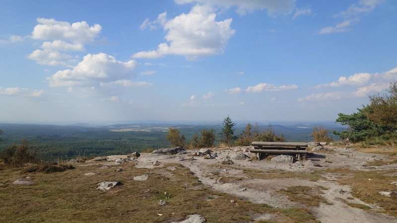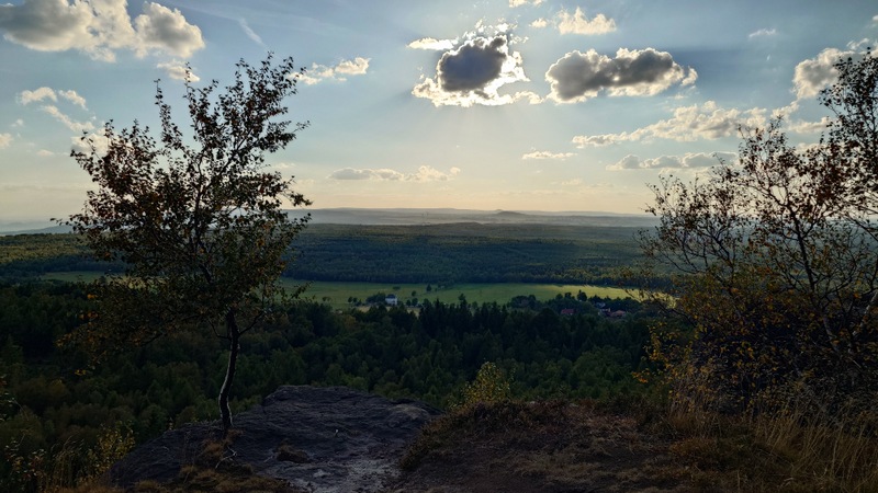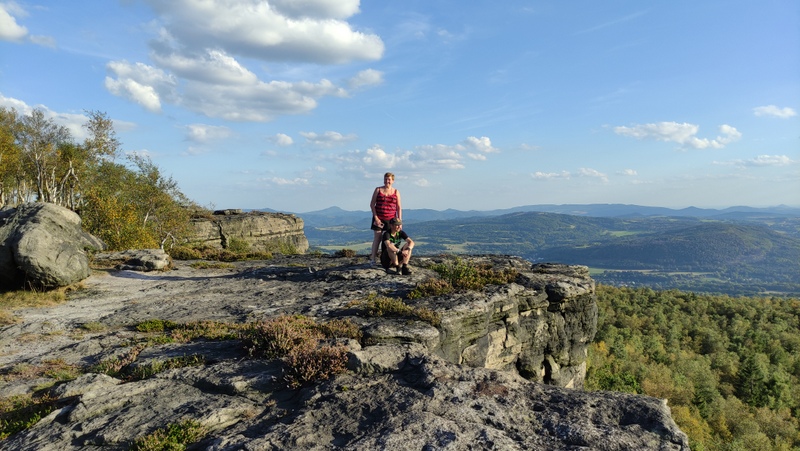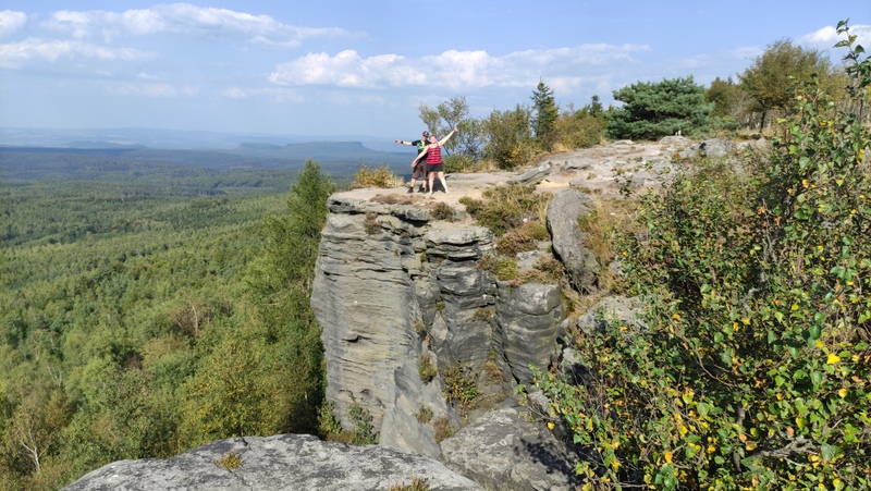 a za zatáčkou se vyloupla Drážďanská vyhlídka s ohromujícím výhledem do Saska s pod námi zalesněnou částí Čech oblasti Labské pískovce.
