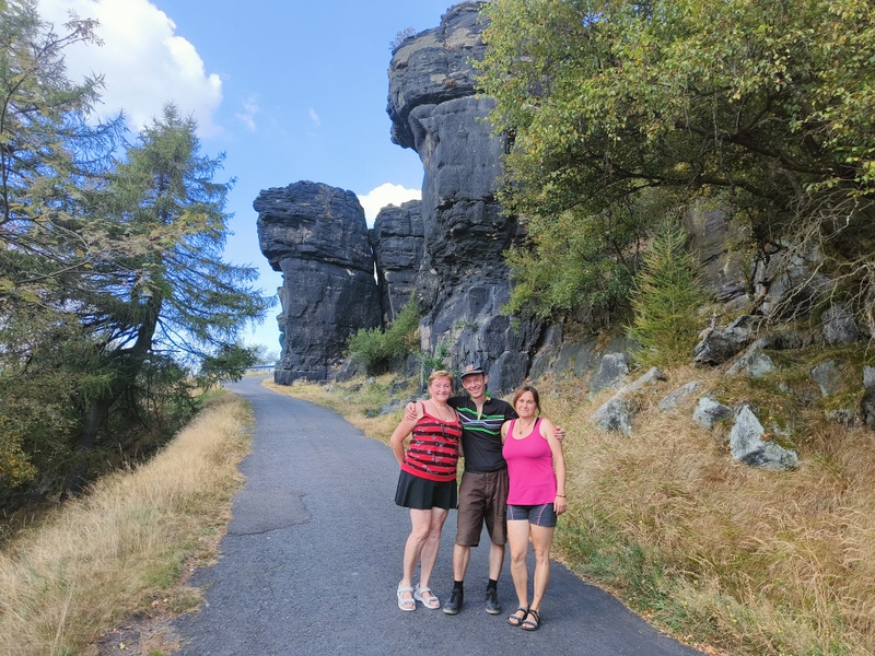 Vyfotili jsme se u symbolu Sněžnické rozhledny vyřezané z kmene stromu a vystoupávali výše. Já se spokojil opět s pěší jízdou. Zanedlouho jsme se nacházeli mezi skalnatými masívy Jarní a Májové skály