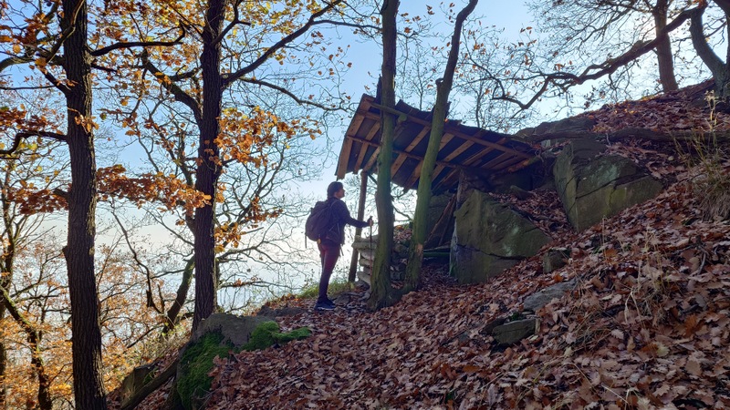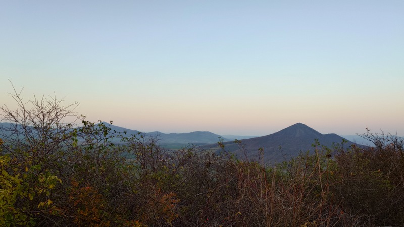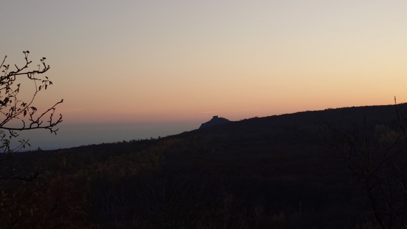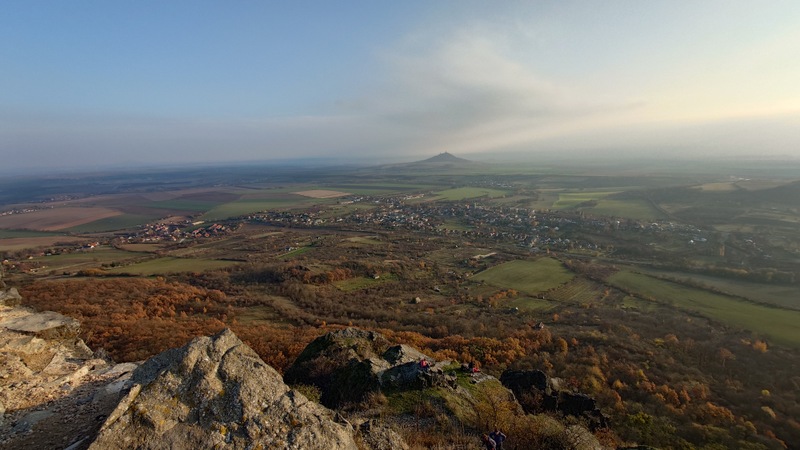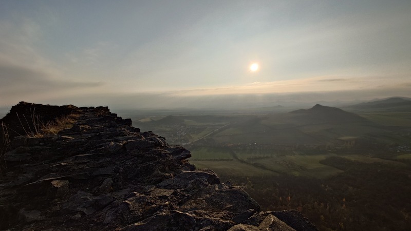 Cestu v lesích přibarvoval mezi stromy západ podzimního slunce. Poslední výstup na kopec s názvem Ovčín. Šárka připustila možnost návštěvy s celou rodinou v minulosti v těchto končinách. Vyškrábali jsme se za šera na vrchol. Barevný horizont s Košťálovem, na druhé straně svítící Lovosice společně vyzařovaly podivnou atmosféru večerního místa.