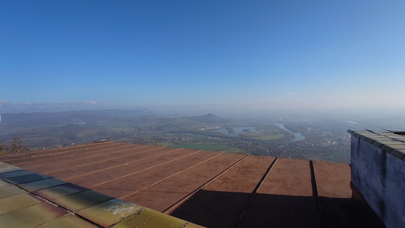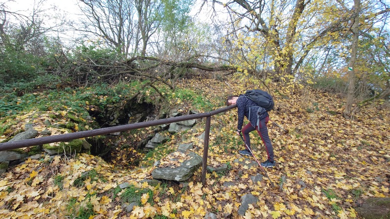 Zřícenina hradu za jehož zdmi se ozývala střelba ze střelnice nevynikala ničím zvláštním. Zatravněné nádvoří se sklepem a poničenými zdmi. Vrátili jsme se zpět na modrou značku na prvovýstup na vrch Lovoš. Šárka nasadila hůlky pro lepší odpich v chůzi. To už se potkávalo více návštěvníků navzájem a čím blíže k rozhledu, tím více turistů. V sedle jsme si odskočili porozhlédnout po Panenských kamenech s výhledem na Litoměřicko.