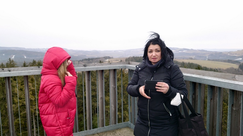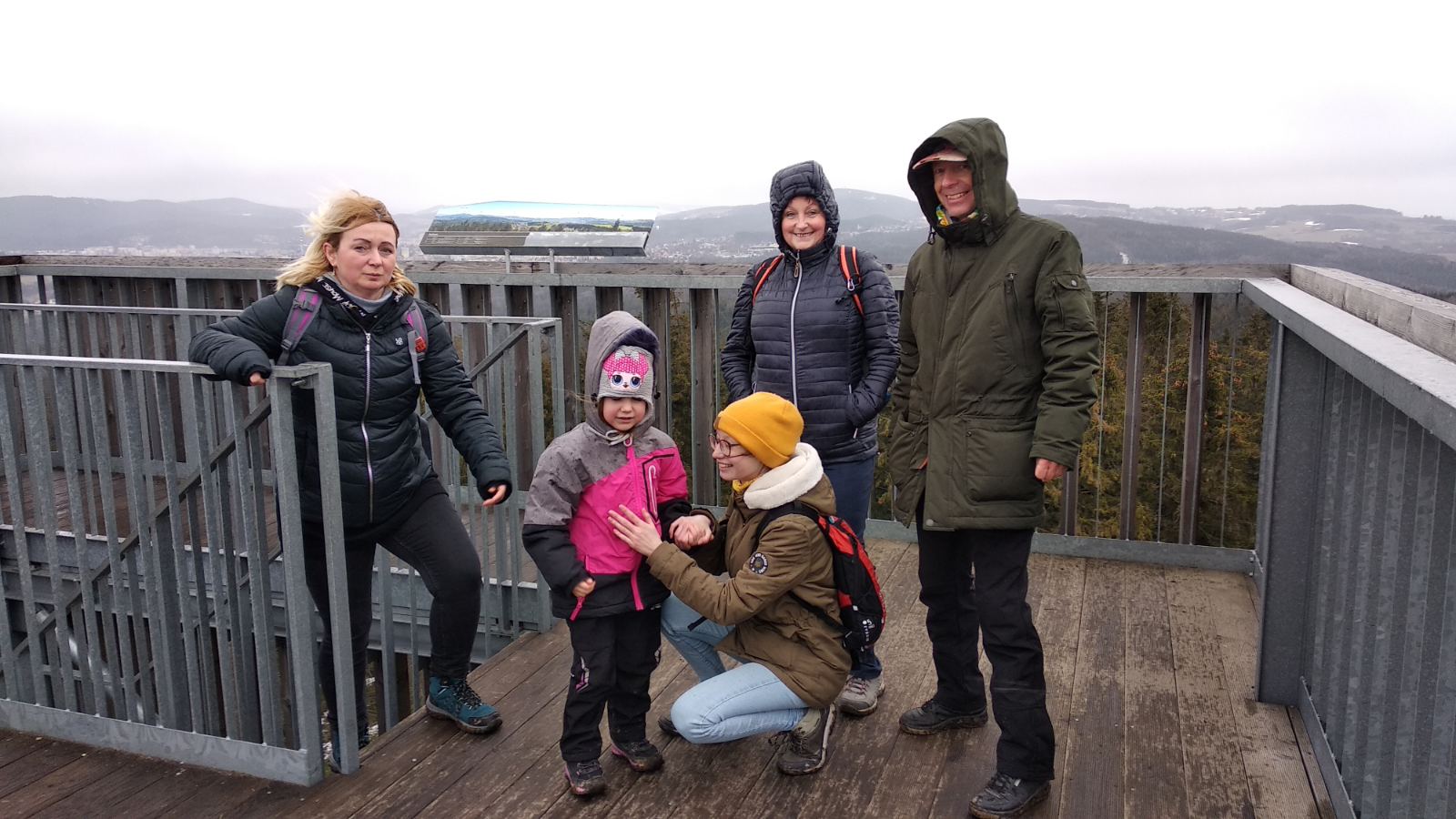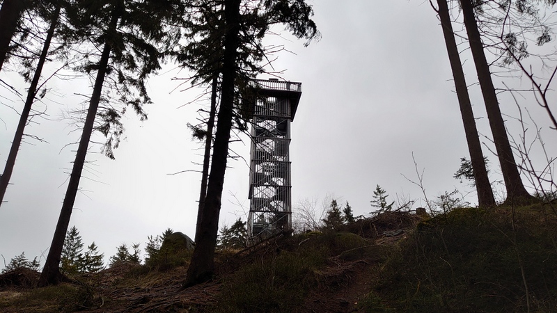 Nová kovová rozhledna na vrcholu udělala některým radost z rozhledu a mrzutost ze silného větru při němž se ani nedalo řádně fotit.
