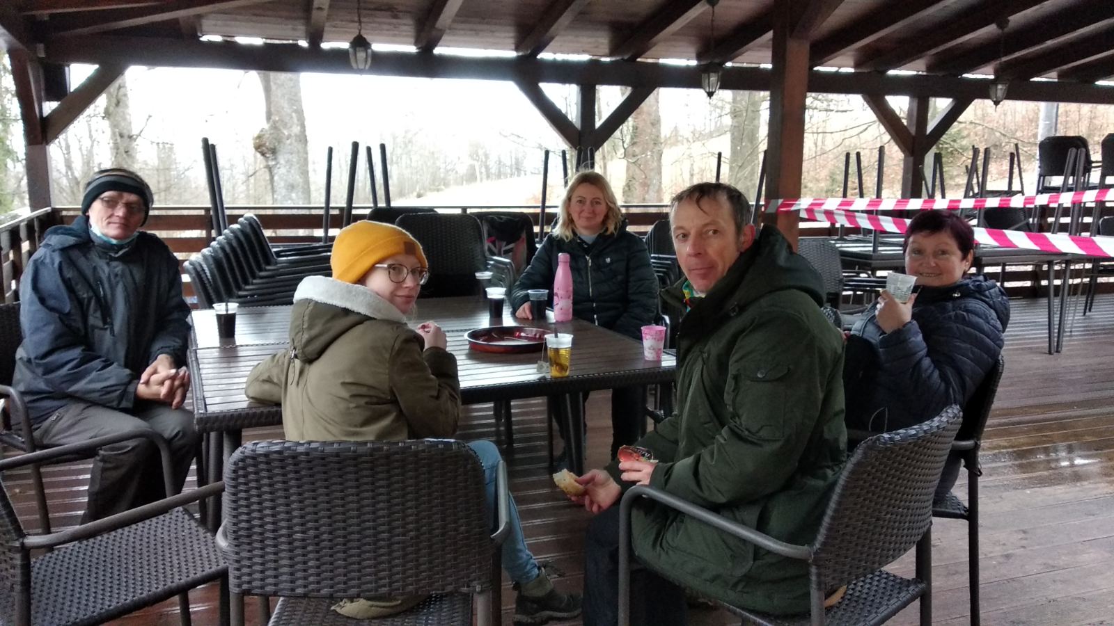 Výdejní okénko nabídlo teplé nápoje s rychlým občerstvením. Po dovolení nám bylo umožněno okupovat uzavřenou terasu a odpočinout si před dotírajícími jemnými kapkami deště. Část party se rozdělila k odjezdu autem domů, zbytek došel pěšky k někomu domů nebo se prošel krajinou pivovarských rybníků ke svému bydlišti. Tímto výletem se pro nás otevřela nová sezóna cestování. Věřím, že v následujících měsících postupně bez omezení.