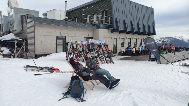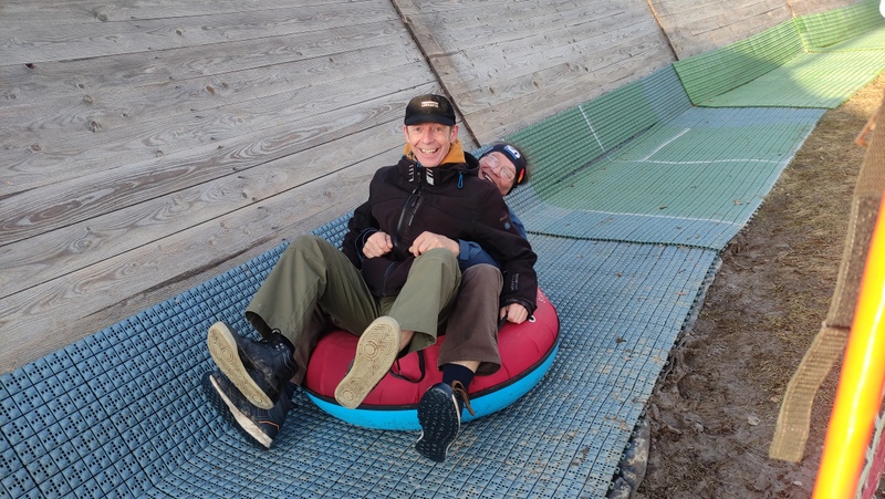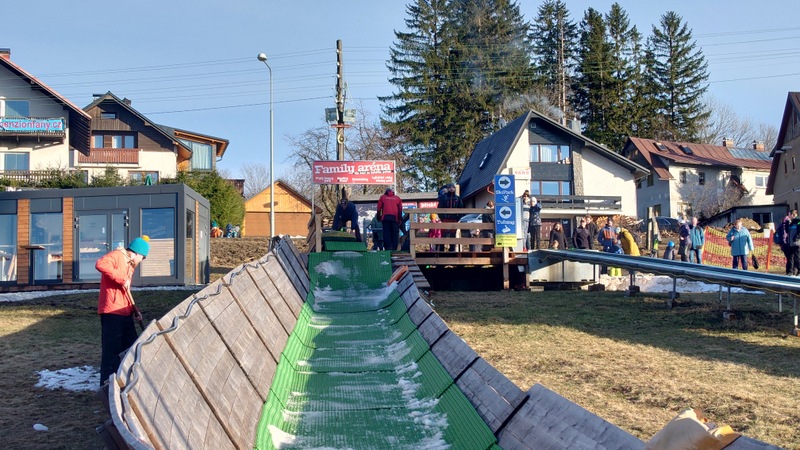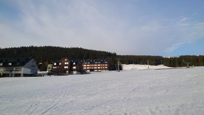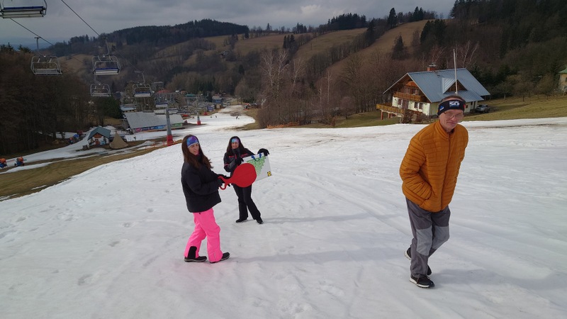 Po příjezdu k apartmánu v nově postaveném domečku jsme zjistili, že lanovka Kejnos, u níž jsme bydleli je zastavena a lyžování zrušeno. Krkonošské svahy v nižších polohách silně připomínající místo zimy jaro, byly poseté jarními bledulemi a sněženkami. První nápad porozhlédnout se po Benecku nás zavedl k centru na snowtubing, což znamená jízda na jakési pneumatice umělohmotným korytem. Samozřejmě zábava především určená pro děti byla výzvou pro naše dětské povahy. 10 jízd nám stačilo, abychom se po dvou vzájemně prostřídali.