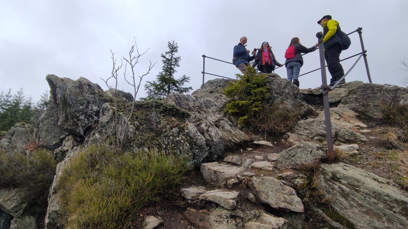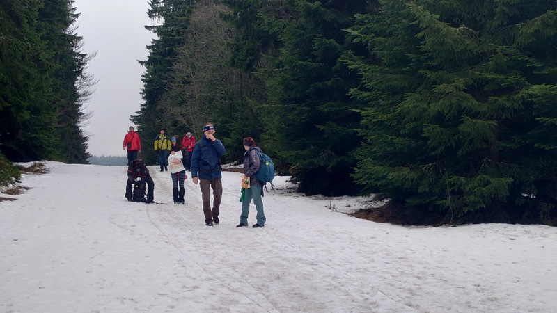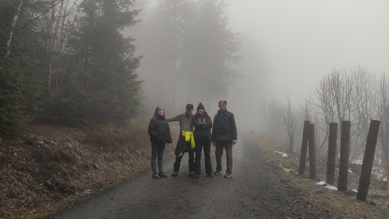 V neděli ráno po snídani vlastně kolem půl desáté dopoledne se skupina vydala na pěší výlet po Krkonoších. Vládík se mnou lovil kopce do aplikace Horobraní, ostatní se těšili na sníh, který se nacházel až ve vyšších polohách. Vzali si ježdík a igelitky na svezení po zadnici.