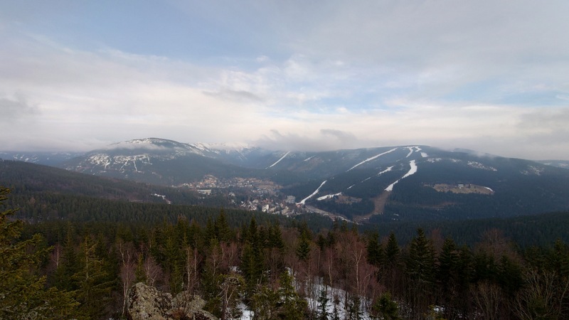Po několika kilometrech jsme stanuli na běžecké trase se živými běžkaři. Z Harrachovy skály jsme vyhlíželi na Špindlerův Mlýn, na Horní Mísečky- náš cíl výletu.