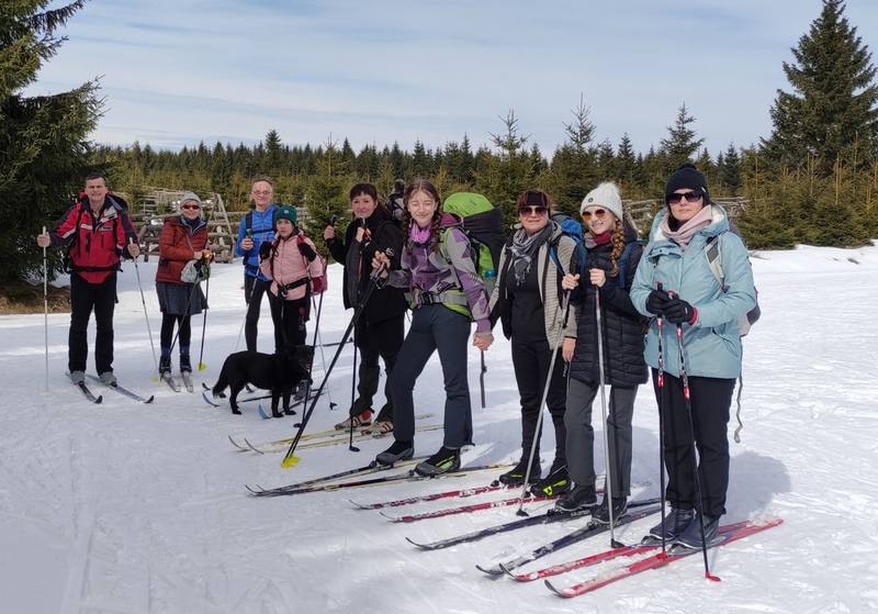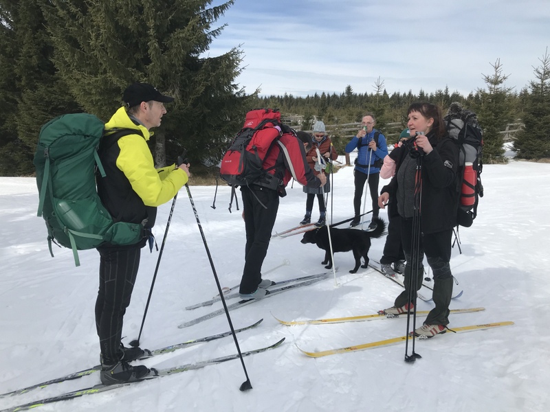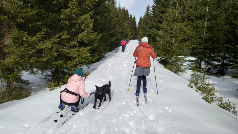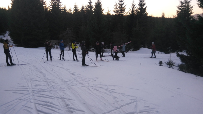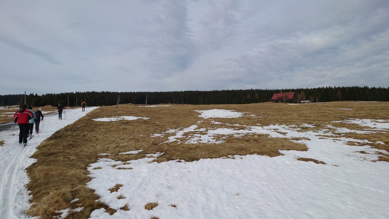 Odpoledne se navrhlo navštívit Velkou jizerskou louku s chatou Gorzystow. Náčelník Jirka určil směr a my se rozeběhli na běžkách kolem Houby po silnici k hranici.