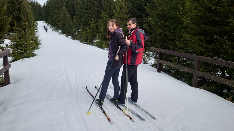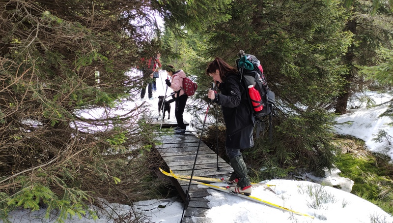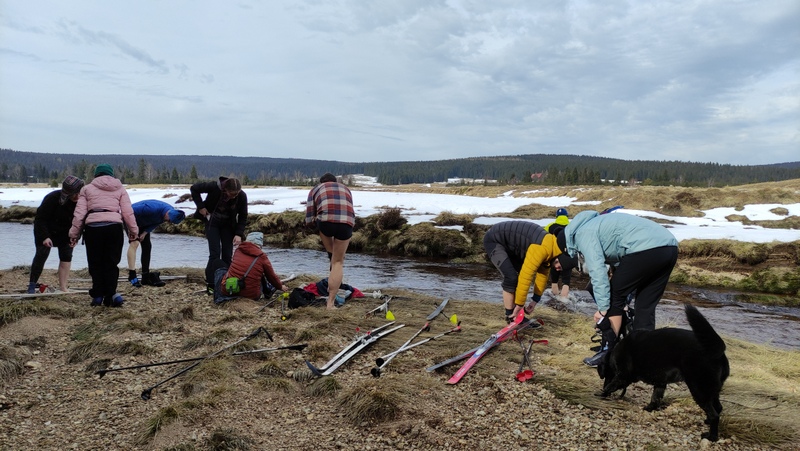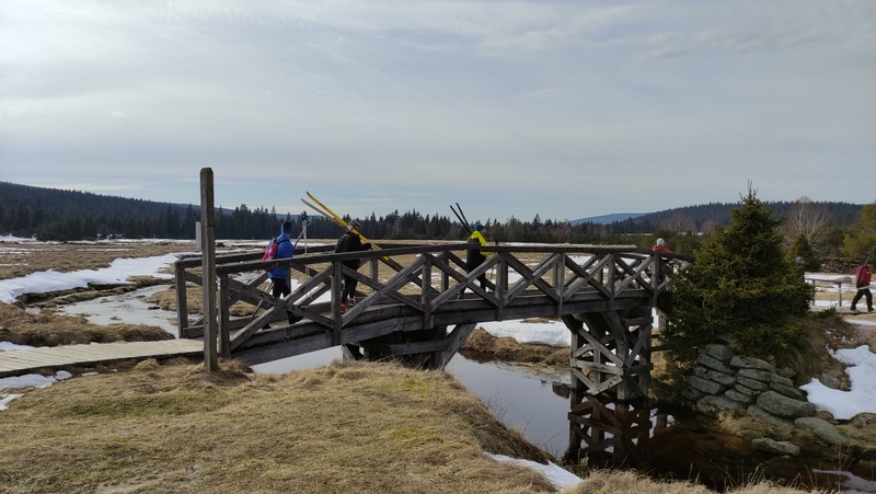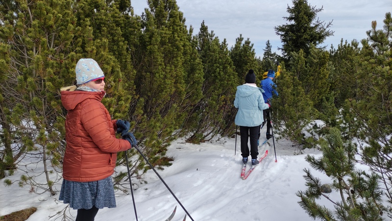 Několik minut po nich jsme do terénu vstoupili my. Navrhoval jsem zpáteční cestu po níž včera přišla většina. Náčelník schválil jet silnicí. Takže jsem opět jel sám. Trasa nebyla z nejlepších, ba první půlka se neběžkovala vůbec dobře po vyšlapaných stopách od pěšáků, druhá vedla dřevěných chodníkem. Opět jsem čekal na křižovatce. Po deseti minutách jsem slyšel hlaholit jejich hlasy. Jenže nikdo se neblížil. Sjel jsem tedy naproti. To bych se těžko dočkal! Dámy se rozhodly, že se půjdou osvěžit do potoka a Jirka s Tomášem chtěli přihlížet. Pochopil jsem, že je to s nimi marné, čekat za rohem a oni se ani neozvou.
