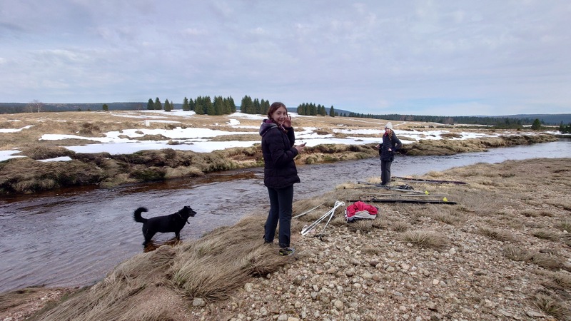 Pak přišlo dobrodružství překračování a hledání ideálního průniku k říčce Jizeře. Ač jsem náčelníkovi hlásil, že oblast je dle mapy zakázaná, jeho odpověď, abych na ně tady počkal, mne očividně neuspokojila. Nalezla se řeka. Sejmuli se běžky.
