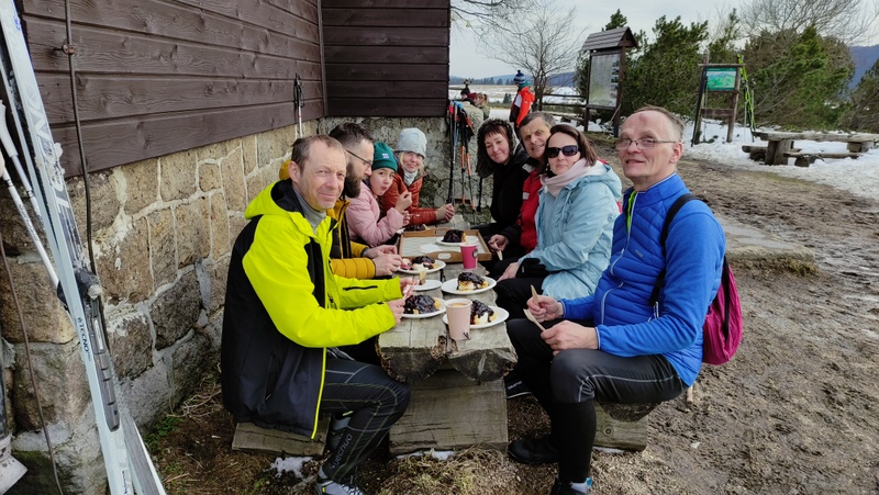 Během cesty jsme potkali Šárku M, jedoucí nám naproti. V Jelence jsme se sušili pojedli společně večeři. To bylo dobrot! Jiřka přinesla/nepekla jablečný koláč, Jirka tradičně mufiny, Šárka zdravé mufiny, Katka s Tomášem přidali též něco dobrého, až se všichni obávali, abychom všechno jídlo snědli. A večer se ohřály párky, s kremžskou hořčicí a chlebem zachutnali i Klárce. Venku se hledala vana na noční koupání, která zde zůstala minule, leč sníh ji dokonale skryl.