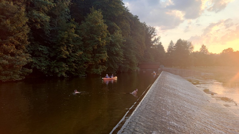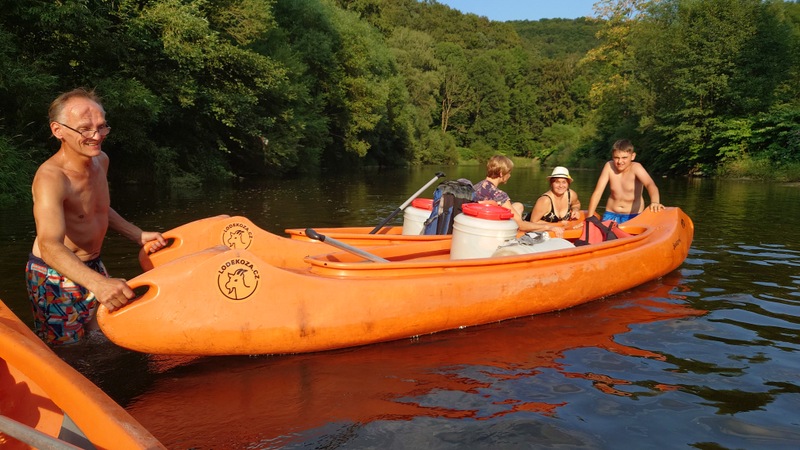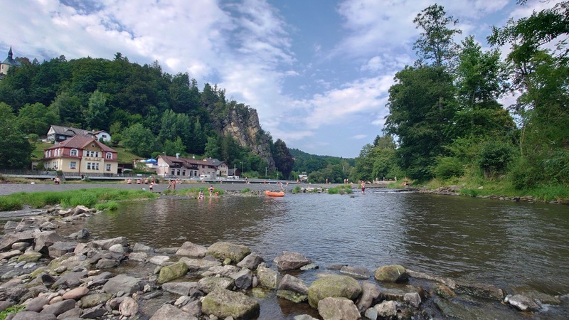 O půl páté nás další jez čekal u Svijan. Opět se přenášelo tentokrát po levém břehu. Přesun lodí se uskutečnil posunem po betonu, což kánoe nelibě nesly. Téměř po celý čas na řece jsem kormidloval sám, poněvadž lady Claire po kratší námaze ihned odpočívala, pozorovala, nudila se a nechávala mi prostor k džentlmenskému vyniknutí. Občas se i stalo, že se i zapomněla někde na mělčině, aby pak kormidelníka doháněla na přetížené lodi u přátel. Jana se Šárkou vzorově pluly před námi, sledujíc přírodu s živočichy. Vladimír se se Štěpánem s námi přetahovali o poslední místo, po té se jeho syn s vděkem usmíval, ohlížeje se na naši bezmocnost. Iveta jako háček se u Jirky neustále slunila.