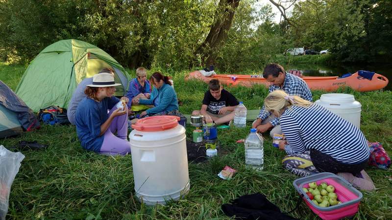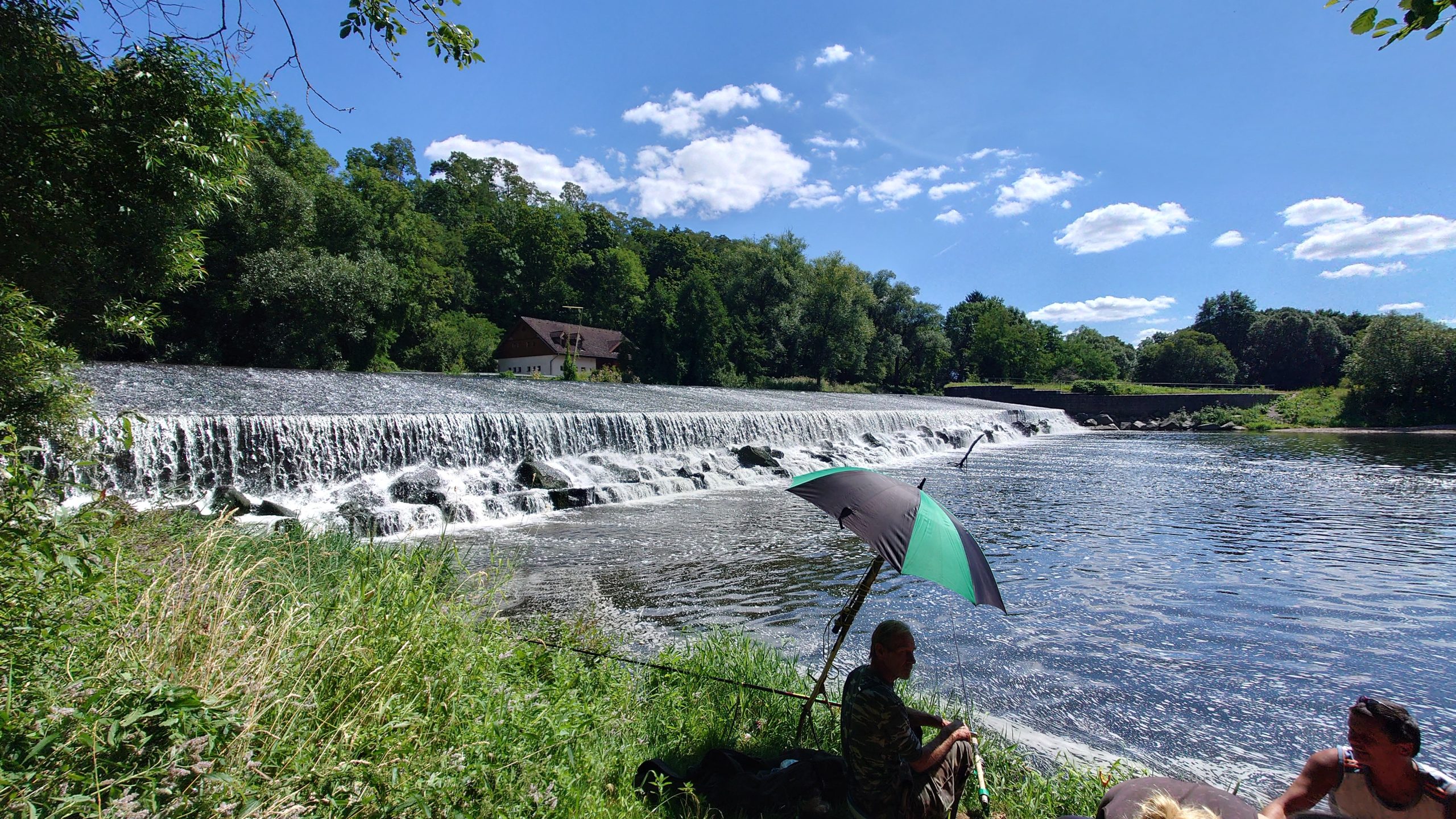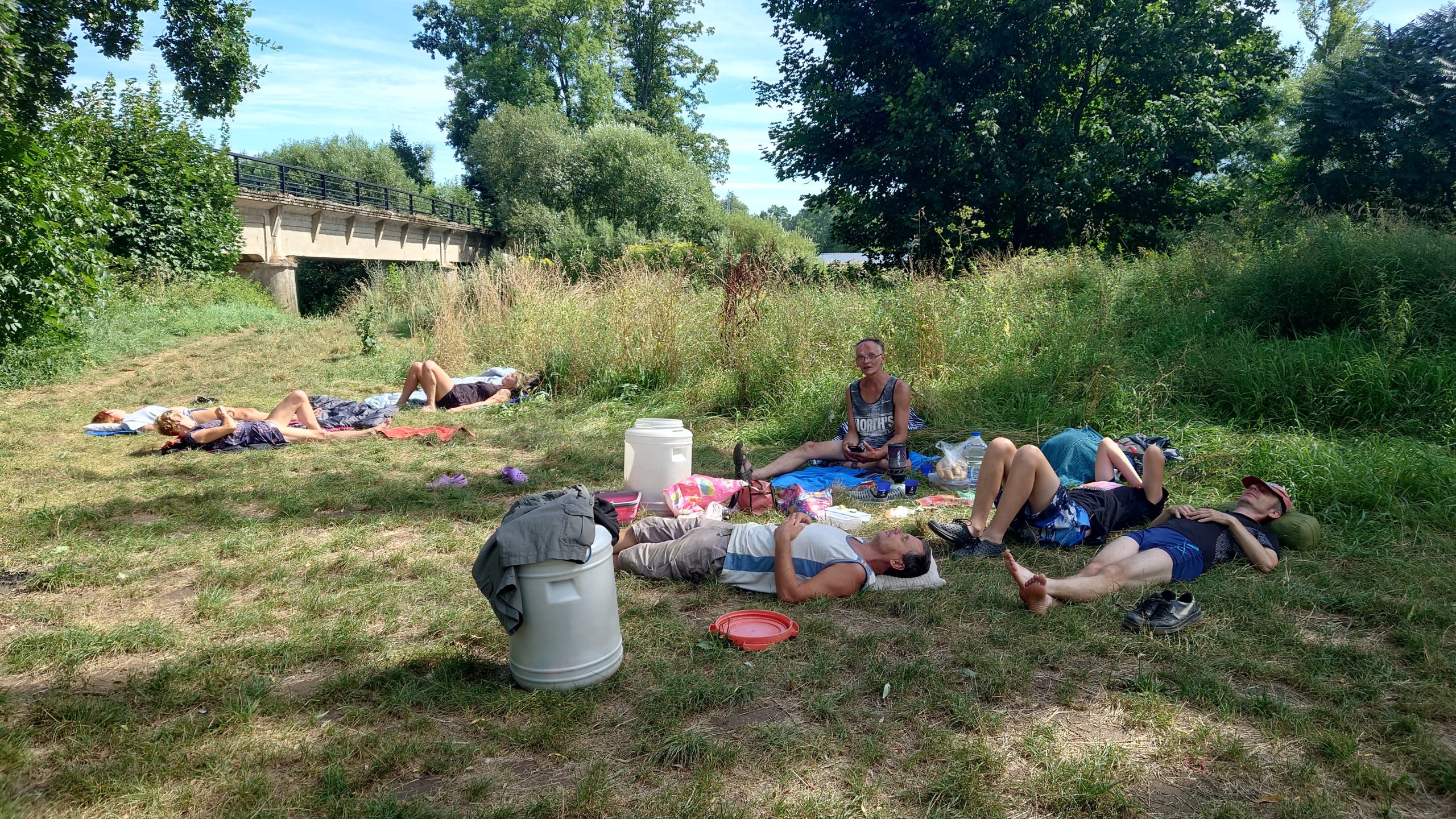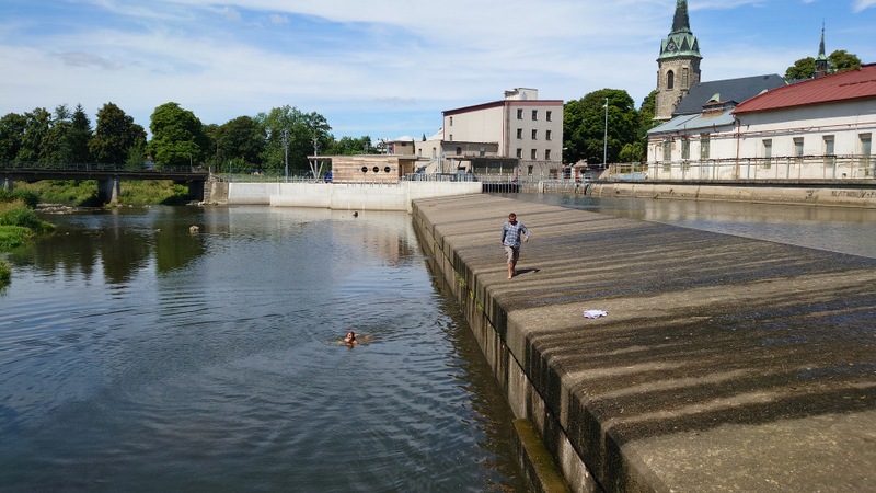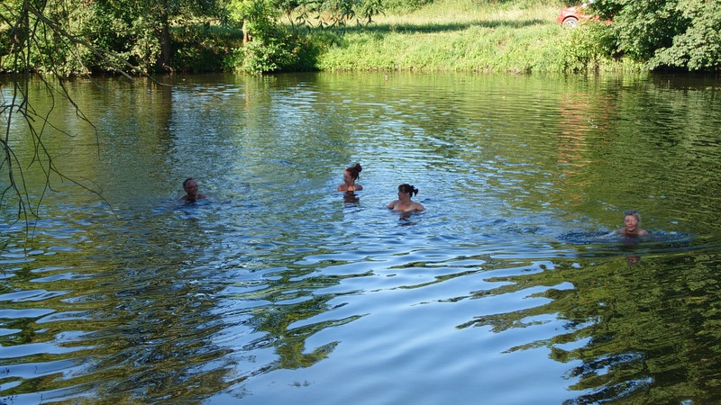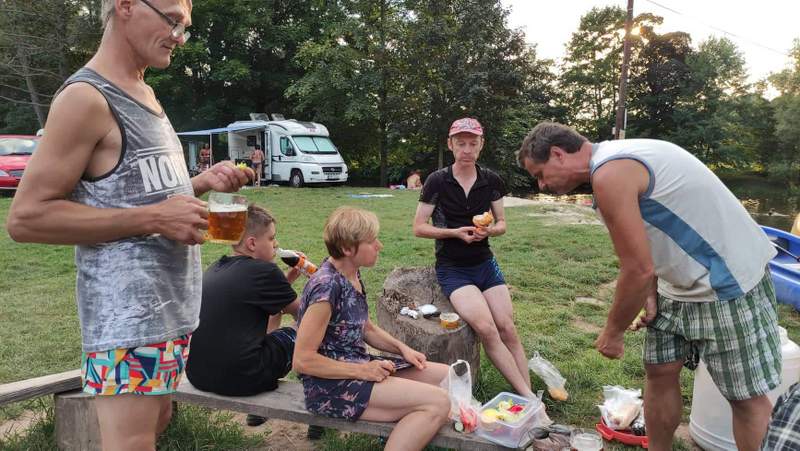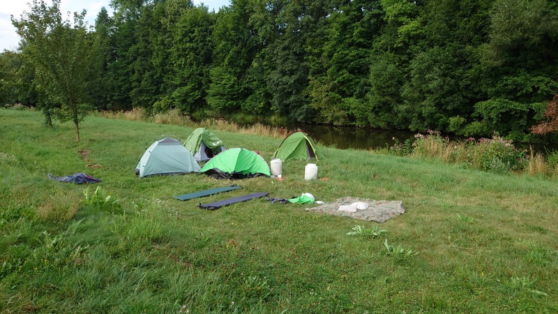 Chvíli jako čtyřka nechali se nést proudem, potom na osvěžení si hupli do řeky, jež byla v některých končinách hlubší více než metr. Před šestou mi bylo navrženo nalezení noclehu. Dle mapy jsem si vyhlédl louku za obcí Loukov. Že tu momentálně zřejmě hasiči zkoušeli hlučné čerpadlo nikomu nevadilo.