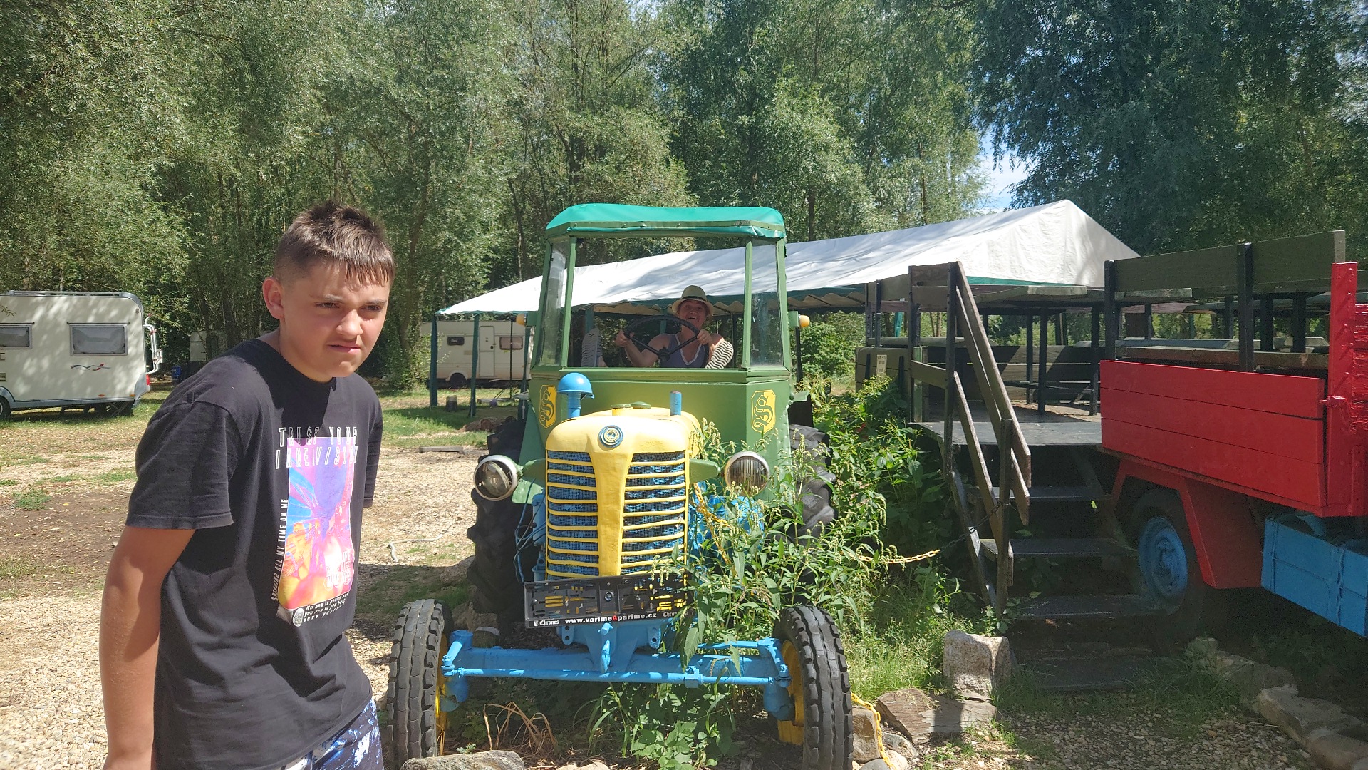 Za hodinku se parta procházela v kempu u Velkého Písečáku. Vystavovali zde staré Barkasy s traktorem, který si Šárka s chutí zařídila. O kousek dál na parkovišti nám pán sběratel ukázal veliký model ozbrojeného vozidla, jež zaujalo Jiříka. Po návratu k břehu jsme se svalili na trávu a odpočívali před náročným plutím.