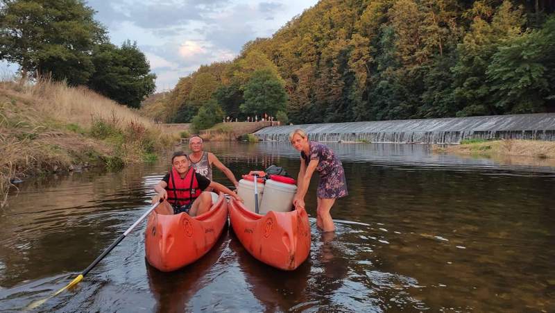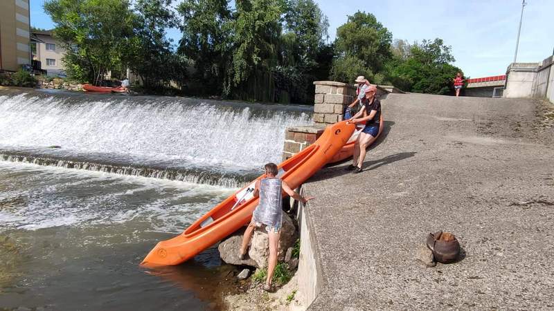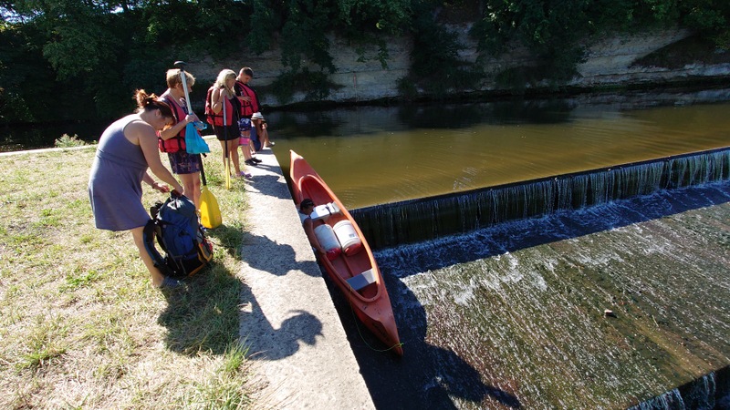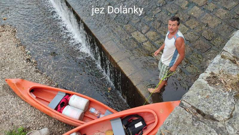 Samozřejmě první jez u Dolánek si musela snášení lodi každá posádka odbýt samostatně. Jiřík dělal zase ramena jak to jde snést po splavu, přidali se k nim neohrožené ženy.