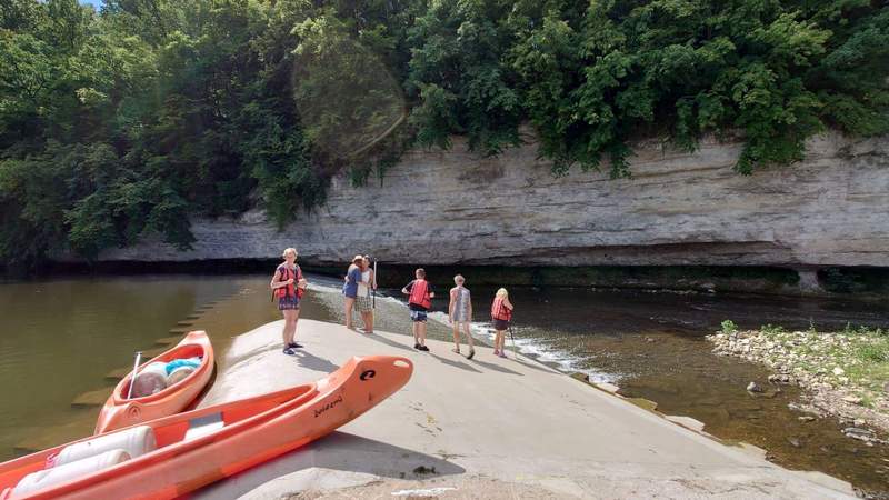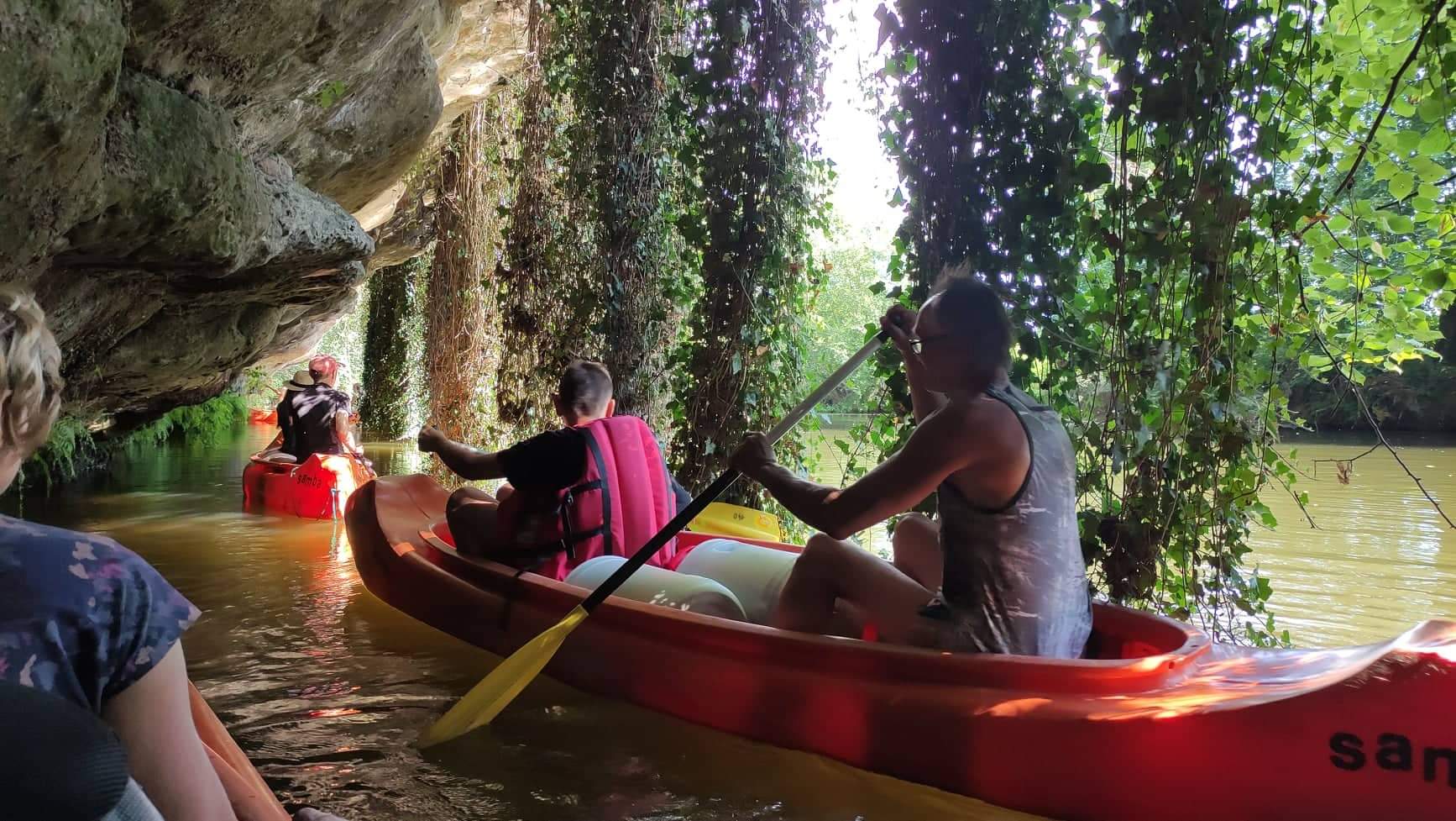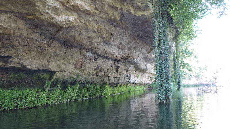 A objevil se pravěk. Kánoe se pohybovaly ve stínu podél mohutné vyvrásněné cca 10 metrové vysoké stěny na levém břehu, která nás ohromila svou délkou i krásou visících břečťanů.