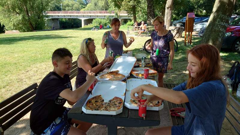 K předání lodí došlo dle domluvy, dokonce řidič svolil k odvozu našich řidičů pro svá auta na Malé Skále. Zbytek party si objednal čtyři velké pizzy s nápoji. Dokonalé odpoledne narušilo jen zvláštní chování jednoho z návštěvníků parku, který se na opalovací lavici neustále zajímal o zvuk plastových lahví, jež všelijak kroutil a nenechával ostatní v klidu. Naše ženy použili stejné zbraně, ale účel se nenaplnil.