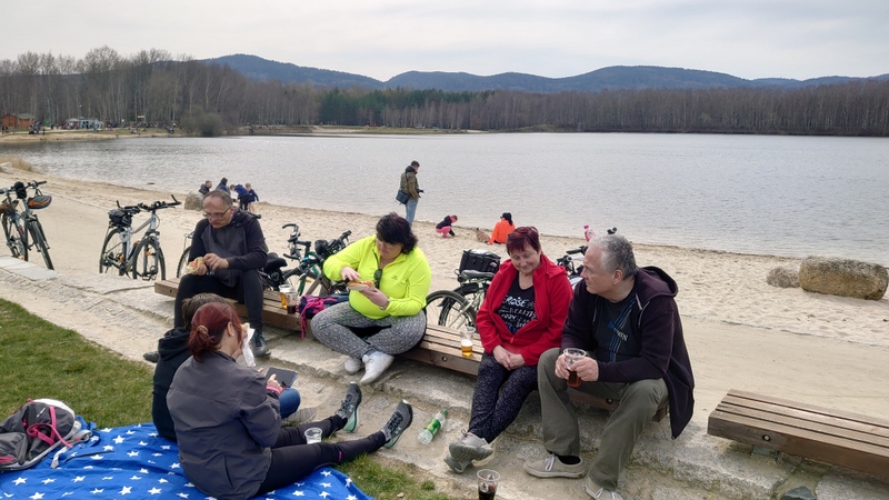 Po dojezdu na zatopený důl Kristýna, která byla obsypána lidmi šťastnými z volného pohybu, jsme obsadili louku na břehu. Hodinka na jídlo stačila i na odpočinek, přesto se vkrádalo chladno , že ani deka nepomohla. Čas na odjezd.