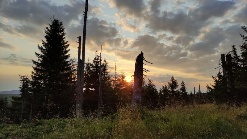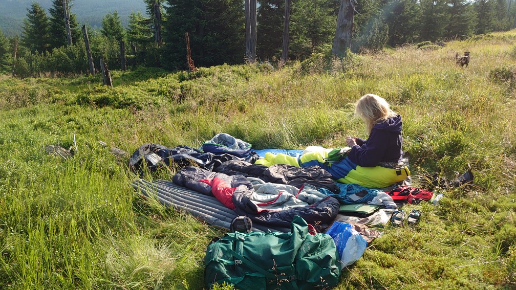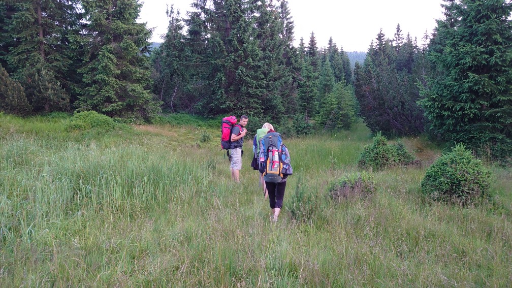 Chůze mlázím blíže potoka s krosnami na zádech dával všem v šeru zabrat. Obuli jsme si boty, neboť v jehličnatém lese po tmě, se nikomu nechtělo riskovat výron či něco horšího, přesto škrábání po travnatém svahu nad potůčkem bylo zážitkem. Močálem jsme prošli za soumraku přímo k Vánoční louce. Hledání rovného místa zde, bylo velmi problematické. Husté trsy trávy nebo sklon terénu ne vždy vyhovoval. Po rozvinutí plachty na zvoleném místě jsme se Šárkou vlezli do spacáku, ale nad námi se Jirka s Ivetou cpali jídlem takový měli hlad. Asi po jedenácté všichni usnuli. Noní rosa klesla i na spacáky, když jsem se v noci probudil spatřil jsem při odskočení do křovin padat hvězdu. Jo, to bude dobrý den! Pomyslel jsem si a také se stalo.