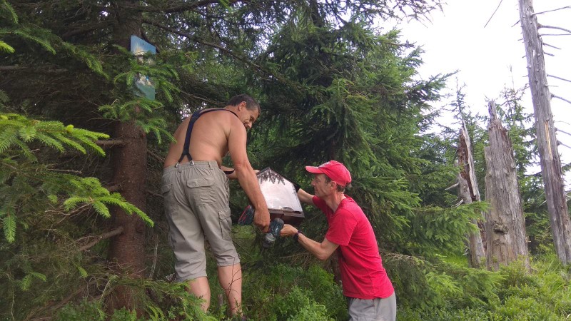 Rozhodli jsme pro dvoudenní misi, abychom se vyspali v horách a ráno byli odpočatí a pracovití. Vydali jsme se tedy vzhůru v pozdních odpoledních hodinách a na místo dorazili těsně před setměním. Stačili jsme pouze rozbít tábor, sníst studeného buřta a vypít pivo. Noc byla klidná, jen trochu z kopce a tak jsme vypadali jak písty neseřízeného motoru. Pořád jsme sjížděli a hrabali se zase nahoru a tak pořád dokola. Ráno jsme vydatně posnídali a opět trochu usnuli, abychom nasbírali ještě více sil. Po druhém probuzení jsme si udělali kávu a vyrazili jsme hledat nové místo pro pověšení obrázku a betlému. Místo jsme nalezli asi o osmdesát metrů západněji a všem se moc líbilo. Nadešel čas obnovy betlémové kapličky.