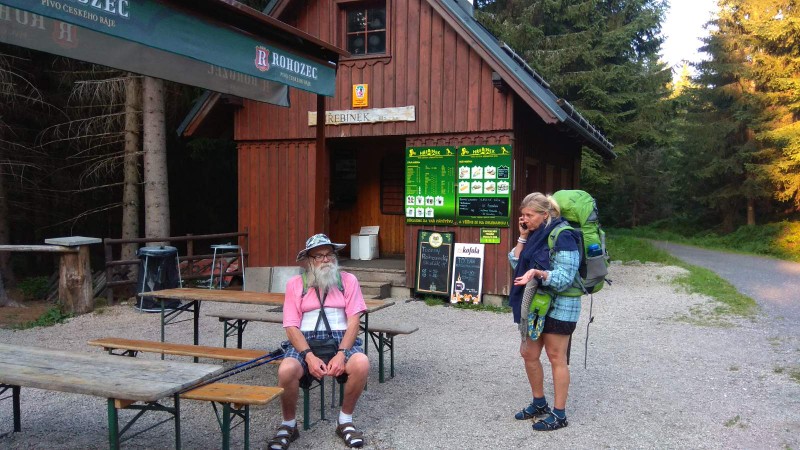 Nevěděl jsem, jestli se k nim nemáme přidat a jet pak autobusem a vlakem, ale pohled na mapu ukazoval, že si moc nepomůžeme. Tak jsme se v Kristianově rozdělili, liberečtí do Liberce a my přes kopec k nám. Před cestou jsem byl Ivetou ošetřen a vyrazili jsme na Panelku. Šlo se mi stále hůř a hůř, na nohu se nedalo došlapovat. Cestou jsme ještě našli Krop-Seffův kříž a pokračovali dál. Z Panelky jsme to vzali zkratkou na Hřebínek. To už jsem přemýšlel, kdo by pro nás přijel? Námahou mě začala bolet i zdravá noha. S vypětím svých posledních sil jsem se dobelhal na Hřebínek, odkud to bylo k autu necelých pět kilometrů. Nikde nikdo, horské cesty osiřely a my sami seděli na zahrádce zavřeného občerstvení. Najednou se zpoza boudy vyšoural stařík o dvou hůlkách, tralaláčkem na hlavě, s brejličkami na nose a šedivým plnovousem, pomalu se dobelhal k nám a přisedl na opuštěnou zahrádku. Holky si s ním začaly povídat poněvadž, jak jsem se později dozvěděl, obě ho znaly. Já jsem se zabýval myšlenkami, jak se dostanu dolů. Nadešel čas začít sestupovat. Sbalili jsme si věci a vydali směr Rauscheckova cesta. Když jsme byli na rohu restaurační zahrádky stařík na mě promluvil jestli bych mu nezapnul telefon. Mluvil směšně česky, protože je původem Francouz žijící na Ferdinandově dvacet let. Bolest nohy byla velká, tak jsem k němu vyslal Ivetu. Stařík ji podal telefon aby ho zprovoznila, že „telefon kaput a že musí volala“ Iveta ho tedy zapnula a podává mu ho nazpět. Stařík telefon nechce naopak požaduje po Ivetě, aby zavolala „hoká sužba“ Iveta nevěří svým uším a tak se ho ptá co se mu stalo. „ Je moc chodiná“ na každé ruce měl jedny hodinky a bylo půl osmé, „ je moc chodiná a sa chvilka tu tma a kdyš tma já padalá.“ Vytočila mu tedy Horskou službu a stařík to zopakoval operátorovi s tím, že pro něj musí přijet, operátor chtěl ještě mluvit s někým z nás, Iveta vše potvrdila a operátor ještě pro kontrolu zavolal zpět, s tím ať stařík čeká, že pro něj pošle auto. Nemohli jsme uvěřit, co se přihodilo a tak jsme si znovu sedli ke stolům a čekali na příjezd záchranářů s tím, že je požádám, aby nás svezli do údolí. Jak jsme tak seděli, pronesl jsem jen, že tomu nemohu uvěřit, přijde stařík a zavolá si taxík. Jak to slyšel, vytřeštil na mně oči a povídá „taxi nééé, hoká sužba“ . Asi měl strach, že by musel platit. Po malé chvilce skutečně přijelo Rauscheckovou cestou auto Horské služby a všechny nás hodný, ale ostrý záchranář naložil a svezl dolů. Děkujeme Ti kouzelný dědečku Kristiáne! On se totiž i kouzelně jmenoval, byl to Kristián.