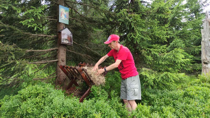Vzhledem k tomu, že nám vše krásně zasychalo na letním poledním slunci, byl čas na svačinu a další kávu. Po kávě jsme si odpočinuli a rozjímali. Nastal čas vrhnout se opět do práce a vlepit do betléma svatého Josefa, který se také uvolnil a hlavně nového Ježíška do jeho postýlky. Betlém byl zakryt ochranným sklem a mohlo se jít věšet. Ještě bylo nutno ořezat na vybraném smrku pár větví a instalace mohla za všeobecné podpory začít. Vše šlo jako po másle, už se jen doladit sklon jesliček a vše je hotovo.