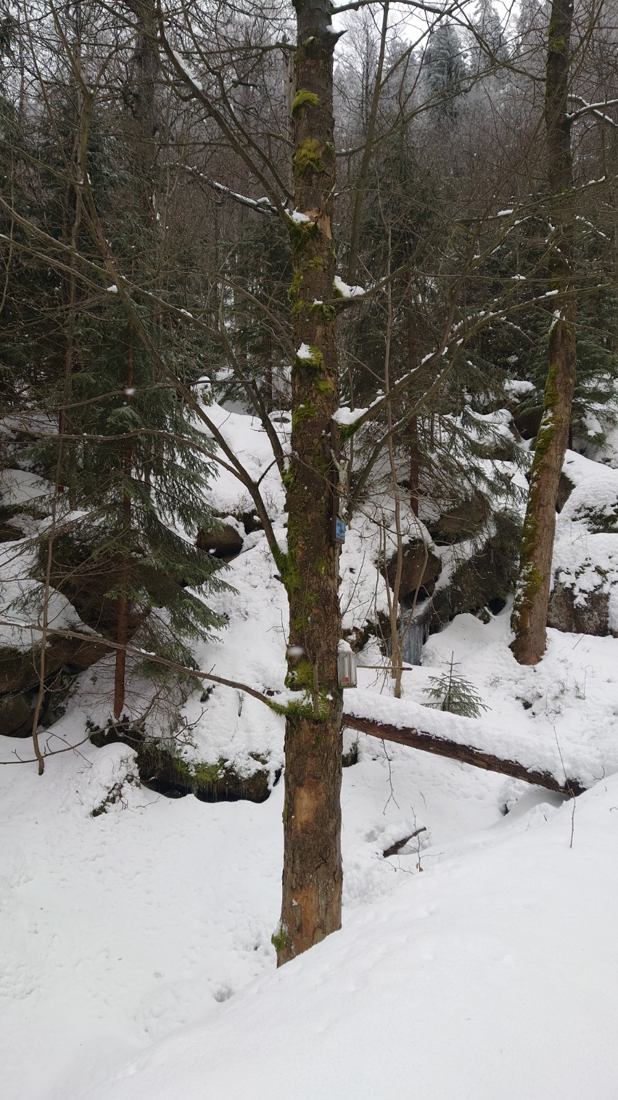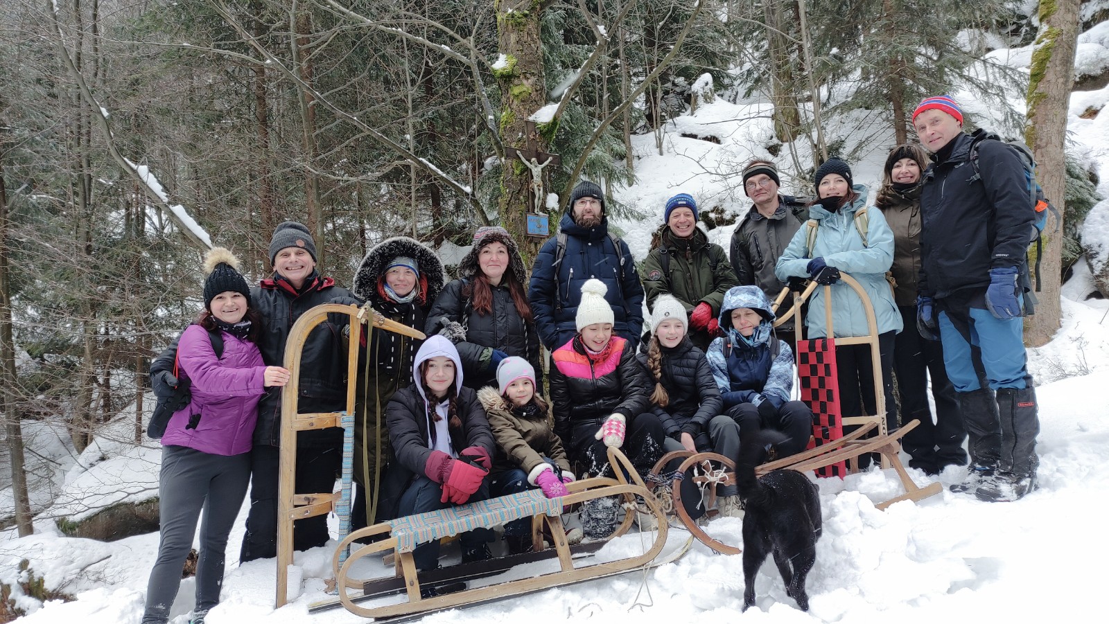 Na stromě pod přibitým křížem plála v lucerně svíčka a ozařovala pietní místo skonu svážeče. Parta 15 osob se památně vyfotila a hurá na saně.