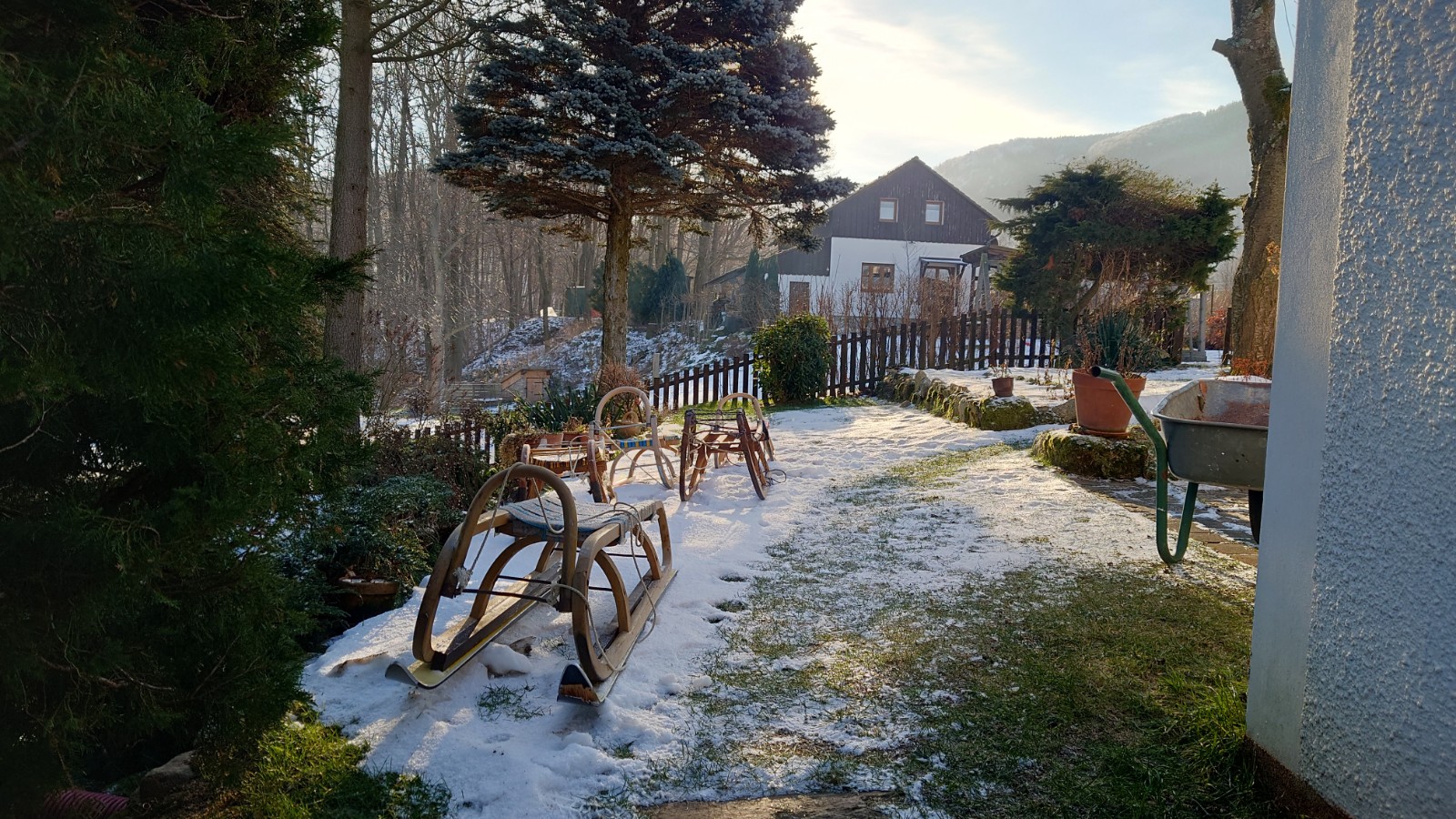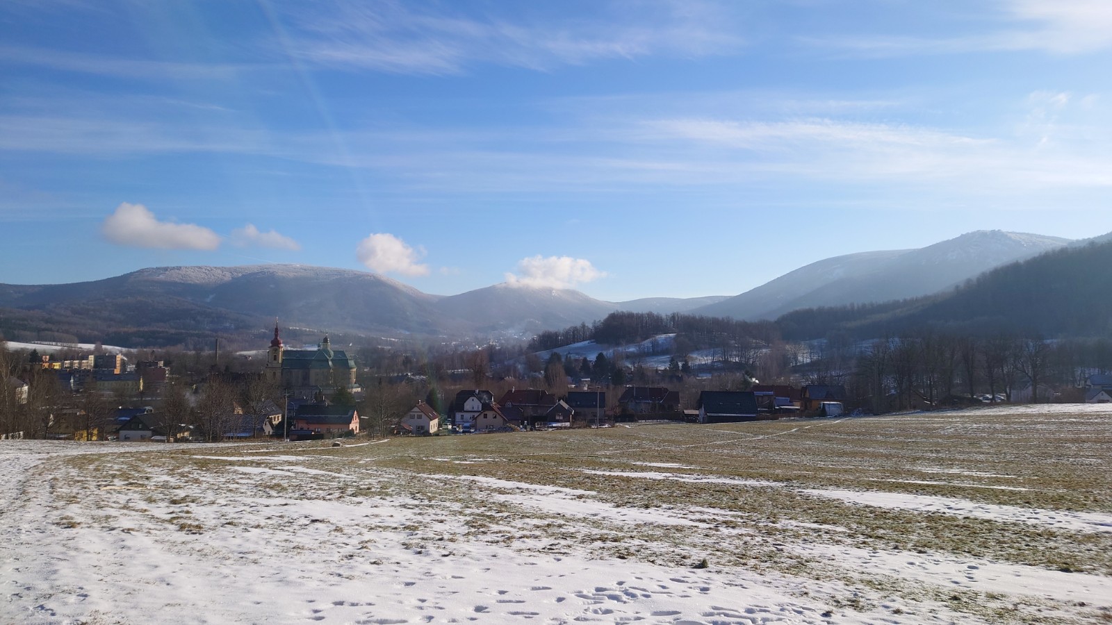 Liberecká část skupiny se opozdila z důvodu zpoždění vlaku, zřejmě po popadaných stromech z vichřice. Stále větrné pošmourné počasí v kraji, zde v údolí nebylo vůbec cítit. Naopak zelené louky dávali příslib brzkého jara. JIrka přijel naproti, abychom nejen uklidili psa Fida do jeho chaloupky. Cestou k Sisi jsme potkali pár lidiček, jdoucí na výlet za zimní přírodou.