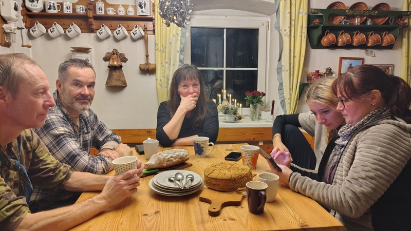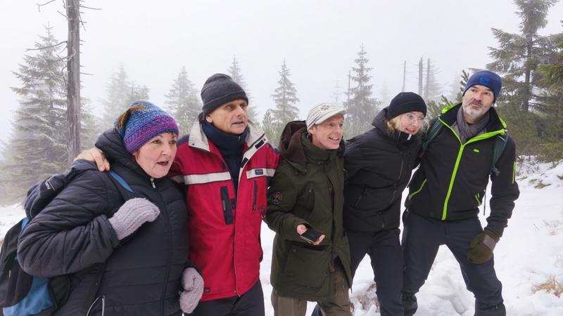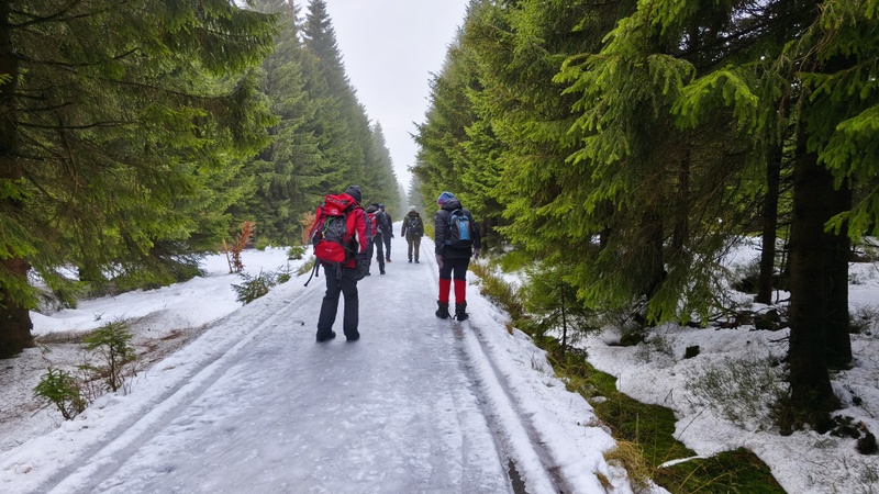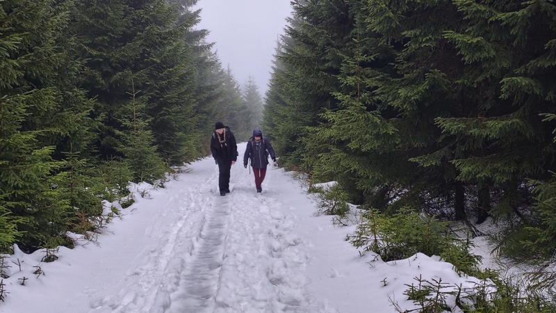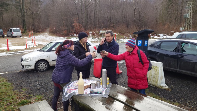 Po klasickém vítacím kolečku s ochutnávkou na parkovišti, na nějž se Liberečáci dostavili první, krom Marty, jsme se vydali po suché cestě vzhůru za zataženého počasí. To nás uvítalo při příjezdu do Hejnic slunečným počasím, nyní se mračna přetahovala s mlhavým kotoučem slunce přinášejíc chlad. V 11 hodin jsme u Sisi přístřešku odpočívali s kvalitní domácí nabídkou všelijakého cukroví, ryby- bábovky či vaječného likéru a kávovým rumem.