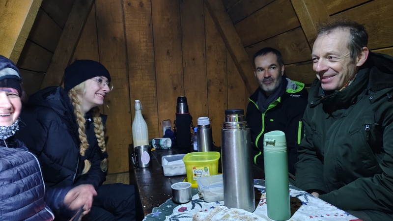 Věděli jsme, že nás dojde Jiřina, proto se v sedle Holubníku v útulně parta déle rozseděla s jídlem na stole.