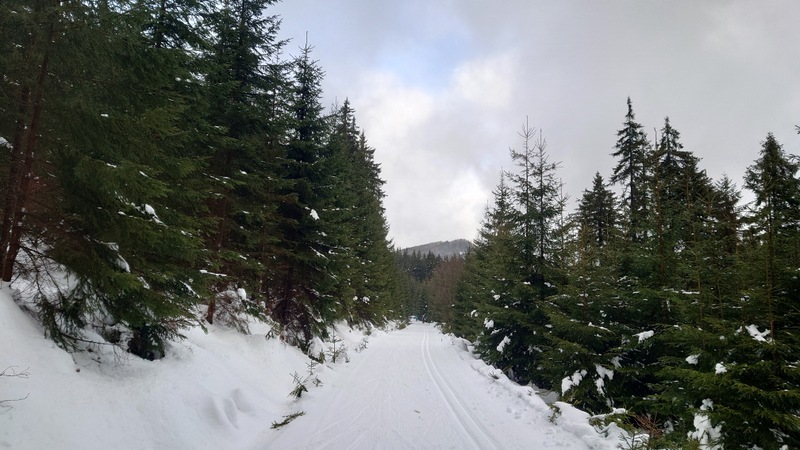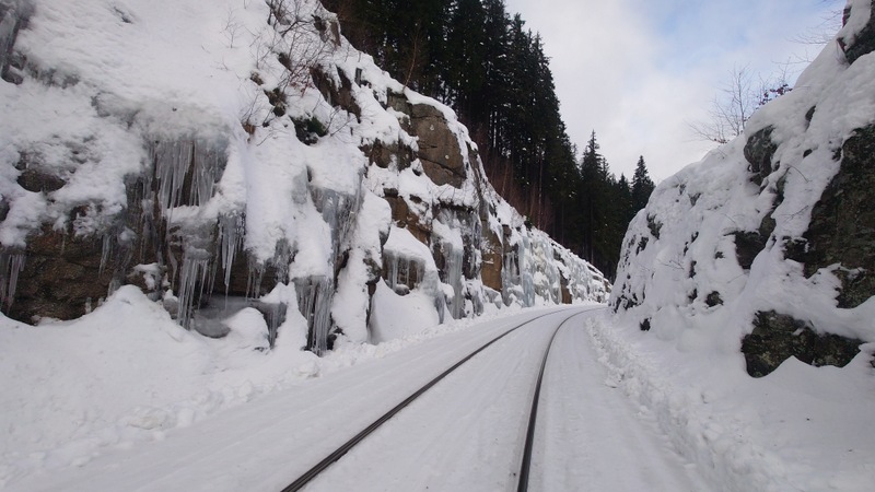 Procházeje skalnatým úvozem s ledopády jsme se chtěl pochlubit jejich krásou. A ejhle, mobil zmizel. Všechny kapsy jsem prohledal, nic. Vrátil jsem se na místo mého sjezdu. Ležel tam na sněhu, brečící po svém pánovi. Utřel jsem komunikátor od sněhu. Bez závady. U menšího můstku přes potůček se mezi kolejemi vytvořily díry, protože zde scházely plechové kryty. Musel jsem překonávat prostor po čtyřech po kluzké koleji. Koleje zatáčely na Harrachov a já se netěšil na opětovné propadání do sněhu, místy až po kolena. Poslední naději jsem vložil pod nedaleký velký železniční můstek, pod nímž vedla širší cesta značená červenou. Jaké to vysvobození. Vytvořili zde rolbou běžeckou trať po níž jít bylo jiné kafe.