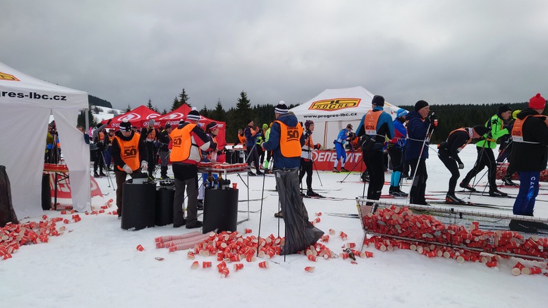 Konečně se trasa zvedla kolem Bukovce k Jizerské pralouce. Zpocený se zbytkem sil jsem meditoval o tom, je li již Vláďa na občerstvovací stanici či ne? Vylezl jsem zpoza lesa na jizerskou planinu, pospíchajíc ke skandujícím fanouškům u zatáčky u Hospody na Jizerce. Snad jsem ho nezmeškal. Kolem běželo na lyžích spousta závodníků, kteří sjížděli mírným svahem k Panskému domu k občerstvení. Pozorně jsem pozoroval, neminu li našeho odvážlivce. Pět minut. Nic. Rozhodl jsem to risknout, protože jsem usoudil, že za dvě hodinky to pravděpodobně nezvládne, odbočil jsem k silnici a běžel dolů ve šlemovité bílé kaši ke stánkům s občerstvením pro běžkaře u bývalé sklárny. Nekonečný had sportovců postupně přibíhal kolem pokřikujících fandících fanoušků k hltu energických nápojů, kousků pomerančů přímo do úst, k převoskování lyží zkrátka, co kdo potřeboval.