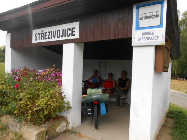 Osvěžující déšť se přečkal pod stromem i na zastávce ve Střezivojicích.  Oblačnost se převalovala na místě nad čekajícími cyklisty a jemně si s nimi pohrávala. Chvíli ustala, aby po té s větší vervou spustila mokrou clonu, očistila silnice se vším co se na ní pohybovalo. Pršení ustalo, my se opět rozjeli s úmyslem podívat se na skalní pískovcové byty nedaleko Střezivojic. Vyhloubené prostory ve skále by se mohly hodit až nebude na nájem. Člověk s fantazií by si tady určitě poradil, jak zařídit skromné byty.