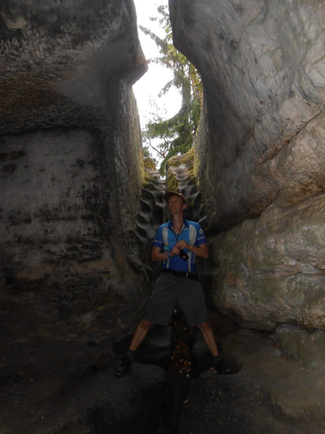 Osvěžení v rybníku v počínajícím velmi teplém dni bylo příjemné pro všechny, mezitím jsem si nechal nabíjet mobil. Po vyzvednutí se telefon vůbec nenabil, spíš úplně vybil. Důvod – prasklý kabel. Trasa zpět vedla okolo hradu Kokořín,     kolem něhož putoval na kole pouze náš nejstarší člen šlapající ve velkém stylu. Setkali jsme se v obci Kokořín v restauraci U koně. Zde jsme se naobědvali (já se pokusil dobít mobil), opět ceny výrazně vyšší, jenže kdo by se chtěl v tom horku trmácet. Před tropickým dnem jsme se schovali do lesů do Šemanovického dolu. Opět v pískovcových skalách nádherně vytvořené jeskyně, které jsme prozkoumali během cyklostezky například Klemperka nazvaná po loupežníkovi,