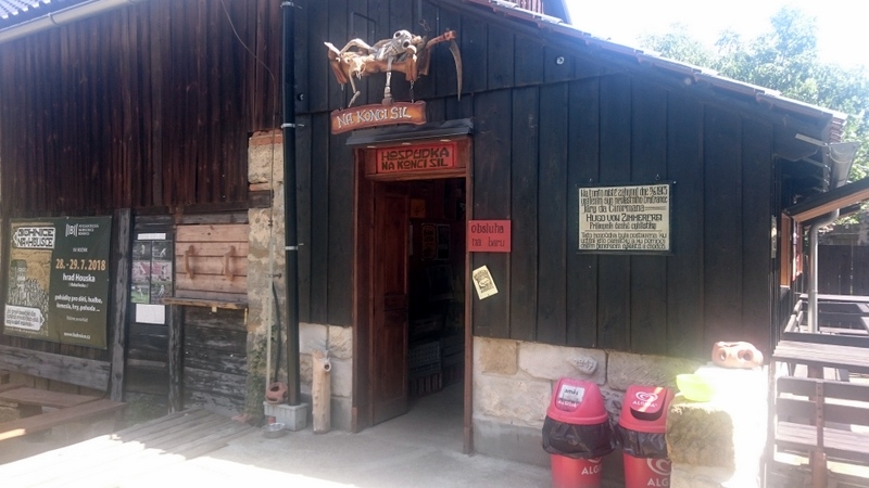 Nasedli jsme na jednostopá vozidla, abychom se osvěžovali průvanem při jízdě. I mírná vrchovina dala zabrat a cestou do Žďáru jsme se rozhodli najít nějakou hospodu s obědem. Terasu s hospůdkou Na konci sil jsme nalezli až pod hradem Houska. Odkaz na Cimrmana byl zřejmý, po přečtení tabulky o jeho zemřelém bratru Zimmerfree  se zlepšila nálada.