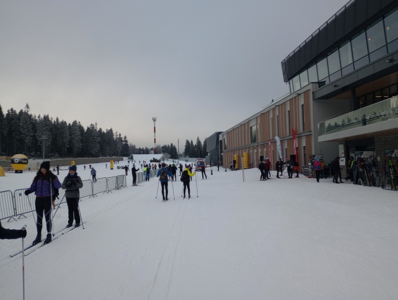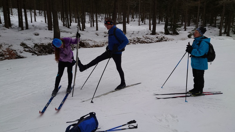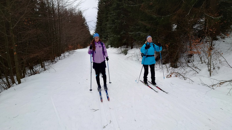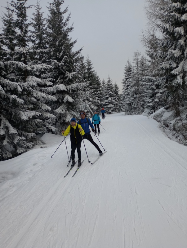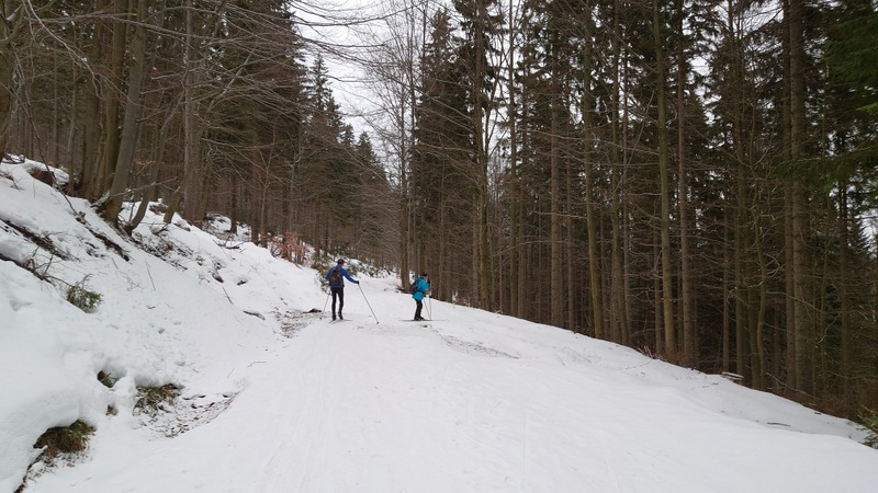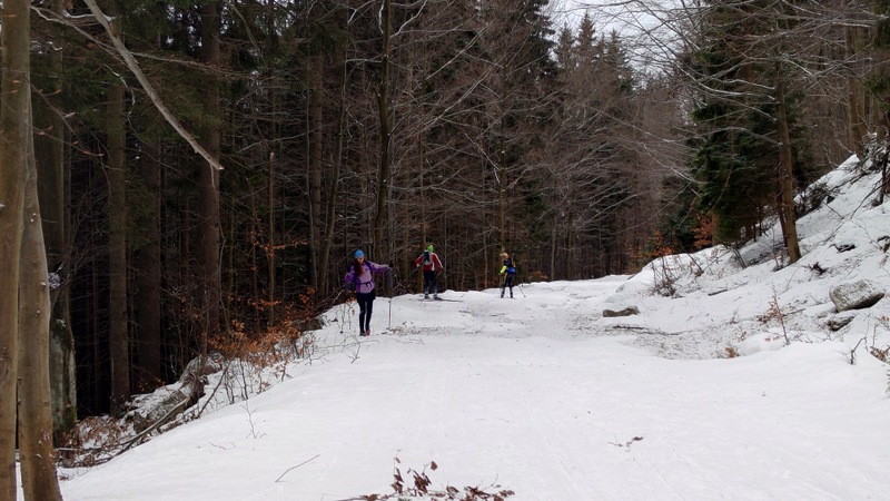 Lednový víkend jsme prožili na tratích Jizerských hor, byť sněhu na české straně hor nebylo mnoho, stálo za to vyzkoušet trasy v sousedním Polsku. V sobotu ráno jsme se sešli tři (Lenka, Vláďa, já) ostatním se tento den nehodil. Vlak nás vezl při zataženém chladném počasí přes Jablonec, kde se k nám přidala  Dana,  do Harrachova. Když jsme kráčeli po kopci k hranici, kdeže jsou doby, kdy se těchto několik set metrů sjíždělo na lyžích, uklidňovali jsme Danu v množství sněhu v končinách polských, neboť jsme minulý víkend trať v pohodě vyzkoušeli. Navíc přes týden trochu nasněžilo. Nastoupil jsme na trasu s překážkami potoků přes cestu,