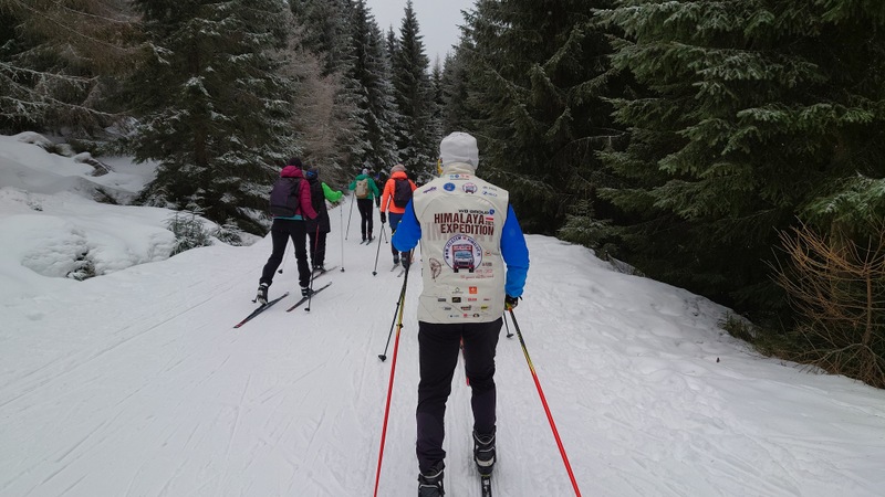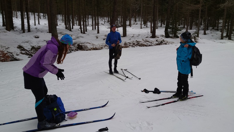 Konečně jsme se ocitli na křižovatce běžkařů s přístřeškem, v němž se kvarteto nasvačilo. Původně se mi zamlouvala okruh na Kragulec, trasa však nebyla pro běžkaře. Rozhodli jsme se pro okruh na stadion Jakuszyce,