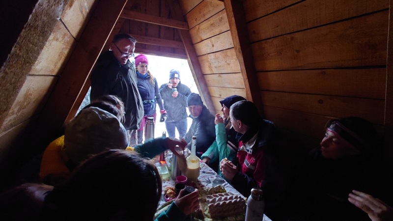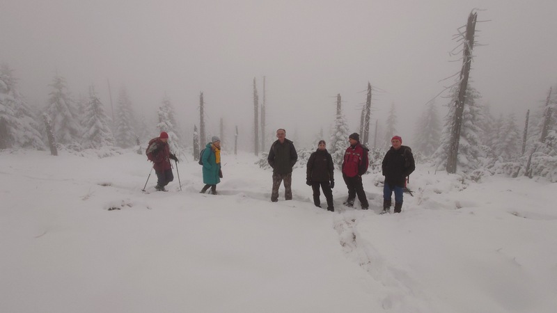 Od Žďárku na Sedlo Holubníku vedla housenka devíti lidí brodících se v řadě k malému přístřešku. Ten byl zčásti obsazen polskými turisty.