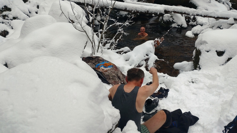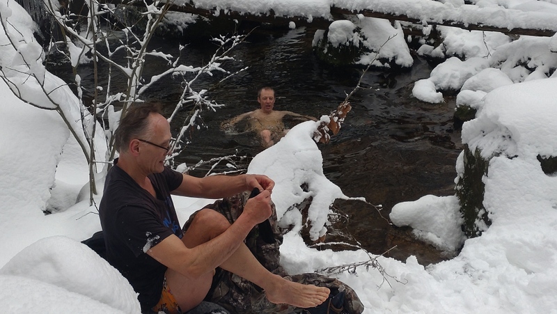 Já jsem poslední dva víkendy absolvoval otužovací několika vteřinové ponory, proto krátký pobyt v potoce pro mne nebyl problém. Vybavil jsem se neoprenovými rukavicemi i ponožkami, přesto jsem vydržel krátce.