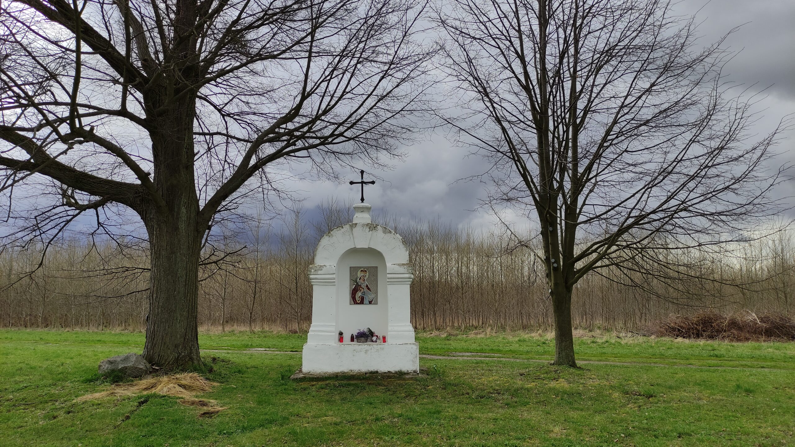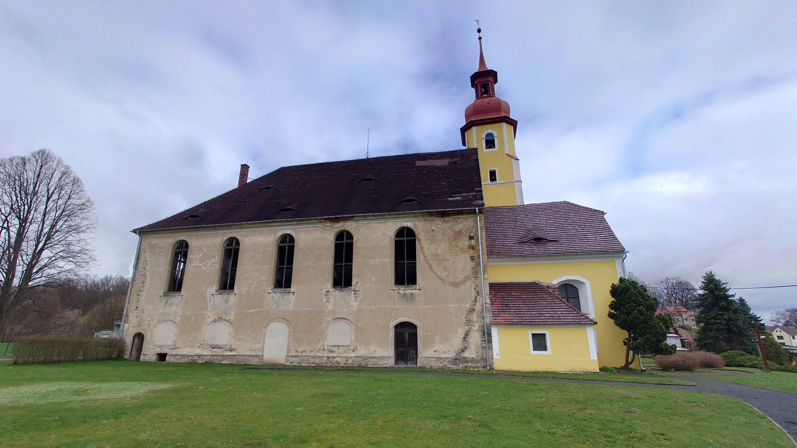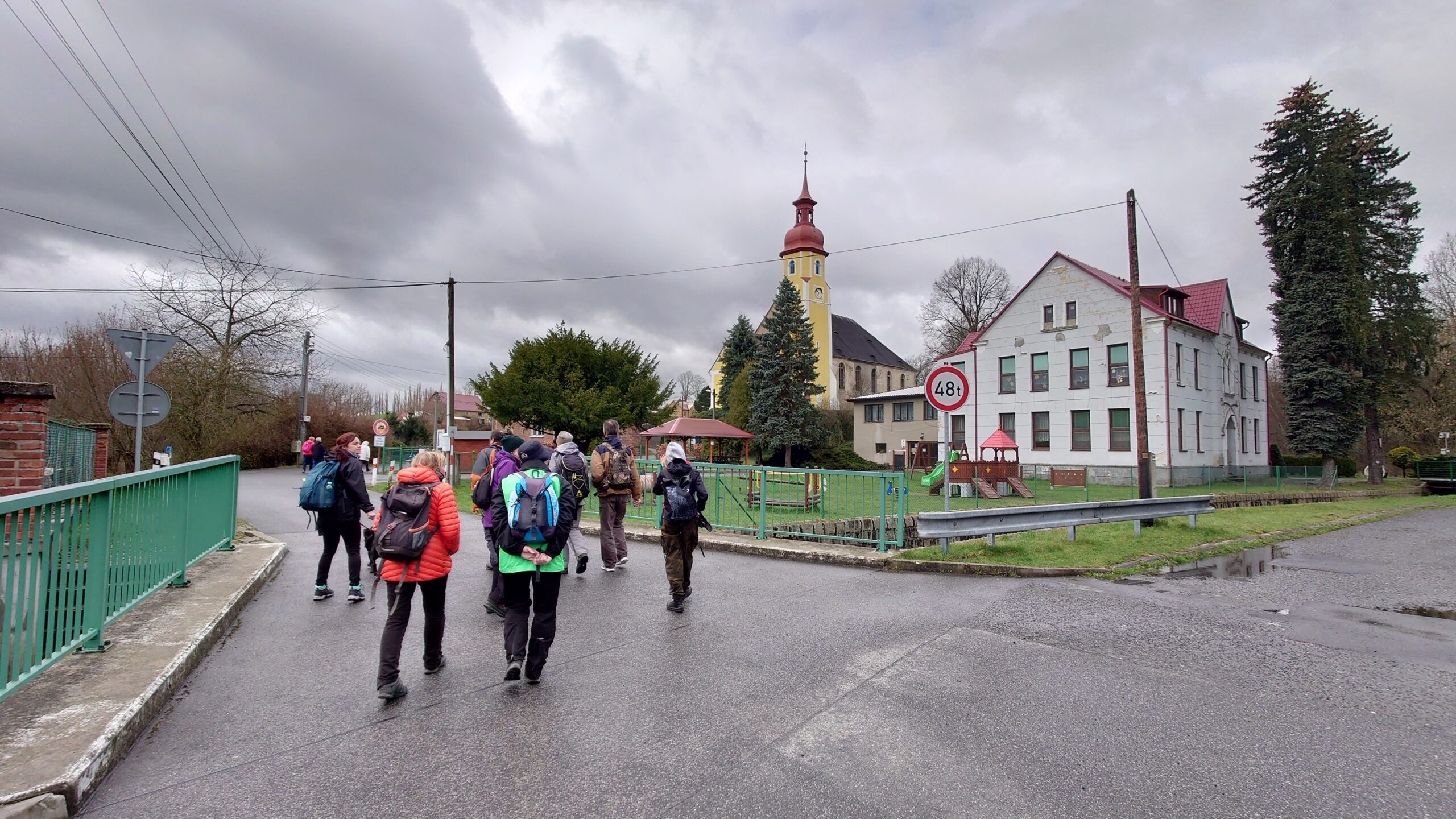 Ze zastávky jsme prošli celou vsí až ke kostelu Seslání sv. Ducha . Kostel se pomalu dává do kupy, zřejmě dle toho jak plynou obci peníze. Fasáda věže je omítnutá v barvě žluté a počítá se i s novou střechou.