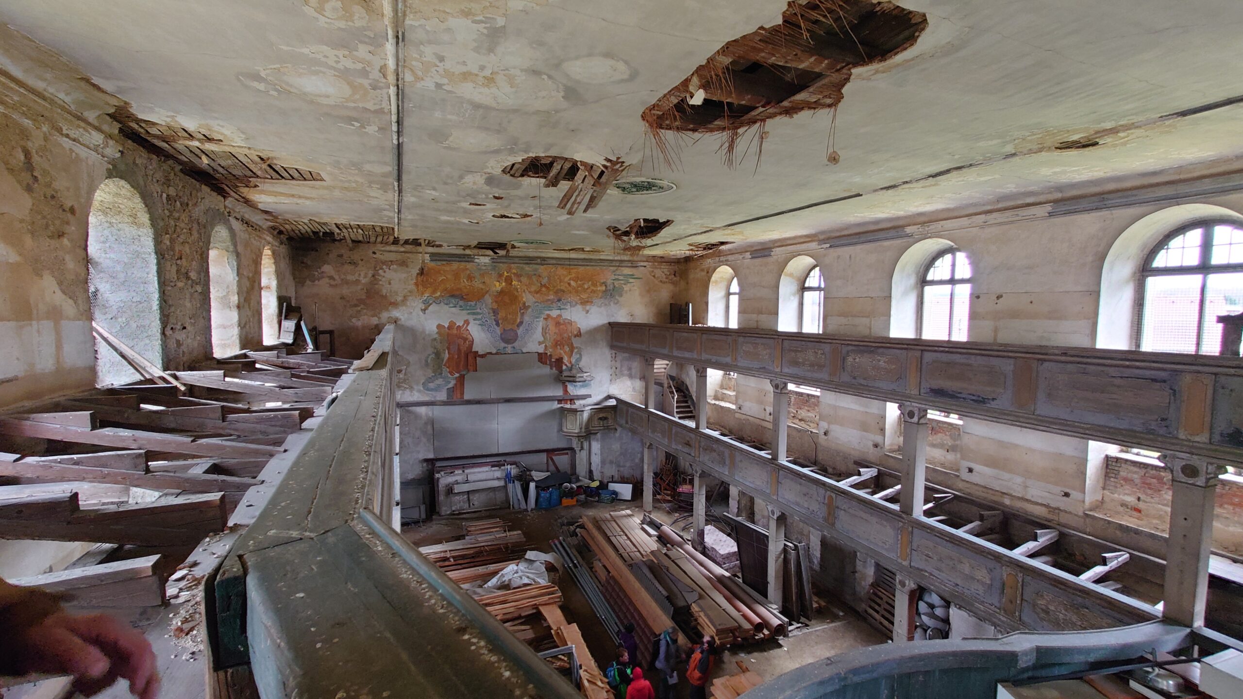 Nahlédli jsme též do obrovské lodi kostela, kam se mělo vejít údajně až 2000 duší. Nyní vnitřek v řádném rozkladu, čekající zbožně na peníze k renovaci.