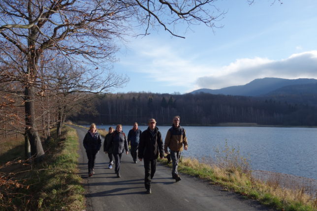 Putování jsme nastoupili v Oldřichově v Hájích stezkou na sedlo, z něhož se klesalo po Viničné cestě k Šolcově rybníku. Během cesty jsme nalezli Patzeltův kříž i desku Hausmannovy smrti.